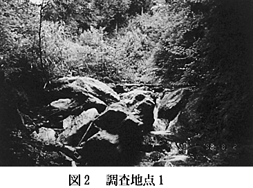 3.調査結果と考察 1)調査地点の様相 調査時に調べた各地点の環境要因を表1に示した。 水温は、藤原谷川の調査地点1で最も低い値を示し、17.0℃であった。一方、最も高い値を示したのは、穴吹川の調査地点10で27.2℃であった。 各調査地点の様相は以下のとおりであった。 調査地点1:藤原谷川の上流部で、岩の間を清らかな水が流れる。谷は浅く、水量も多くない。かなり荒れた感じである(図2)。