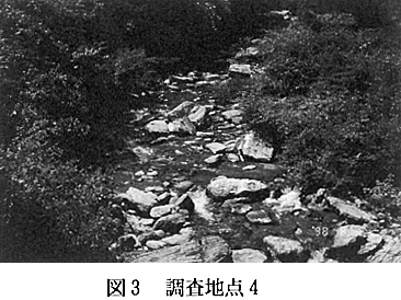 下ったあたりで、流幅も広くなり大きな岩が河床を形成する。水量も多く、深い谷となる。 調査地点4:北又谷川との合流点付近の平和橋下である。内田谷川は、上流部では河床が荒廃し、水生昆虫類の生息に適さない状態である。また、谷が深く、この地点あたりまで調査地点が設定ができなかった。やや荒れた様相を呈する(図3)。