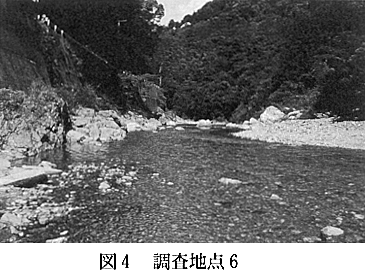 調査地点5:北又谷川も谷が深く、調査地点の設定が難しく、内田谷川との合流点近くに設定した。この場所は、かつて長尾小学校があった所である。河床はやや不安定な状況であった。 調査地点6:穴吹川の川瀬橋付近である。丸みのある石が多く、石の表面には藻類の付着が見られず、増水のためかなり河床が洗われている状況であった(図4)。