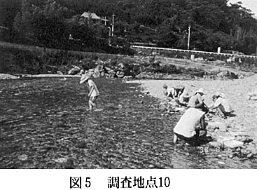 調査地点7:鍵掛付近で、水量も石礫も多いが、やや不安定である。 調査地点8:恋人橋付近で、清らかな水であるが、河床はかなり荒れている。 調査地点9:宮内の白人橋付近で、こぶし大の石礫が多く、安定した様相を呈する。 調査地点10:ブルーヴィラあなぶき付近で、たびたびの増水により河床はかなり不安定であった。昼間は、多くの人が水遊びに興じる所で、そのため河床も不安定である(図5)。