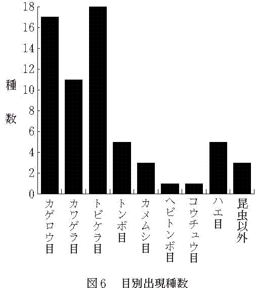 調査地点11:初草の仕出原橋付近で、河床は安定していた。 調査地点12:グリーンヒルあなぶきの下付近で、石礫が多く、流れもややゆるくなり、比較的安定した状況であった。この付近も大勢が水遊びに興じる所で、夏季は河床が不安定になる。 2)出現種と出現種数 採集された水生昆虫類の目別出現種と種ごとの個体数を地点別に整理したのが表2である。 水生昆虫類の総出現種数は、8目62種で、目別に見ると、カゲロウ目17種、カワゲラ目11種、トビケラ目18種、トンボ目5種、カメムシ目3種、ヘビトンボ目1種、コウチュウ目1種、ハエ目6種で、昆虫以外の底生動物が3種である(図6)。