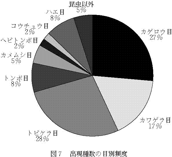 総出現種数に占める各目別出現種数の割合をみると(図7)、カゲロウ、カワゲラ、トビケラの三つの目で全体の72%を占めている。水生昆虫類の全出現種数に占める割合では、74%になる。出現種数の多くがこれらのなかまで占められている。
