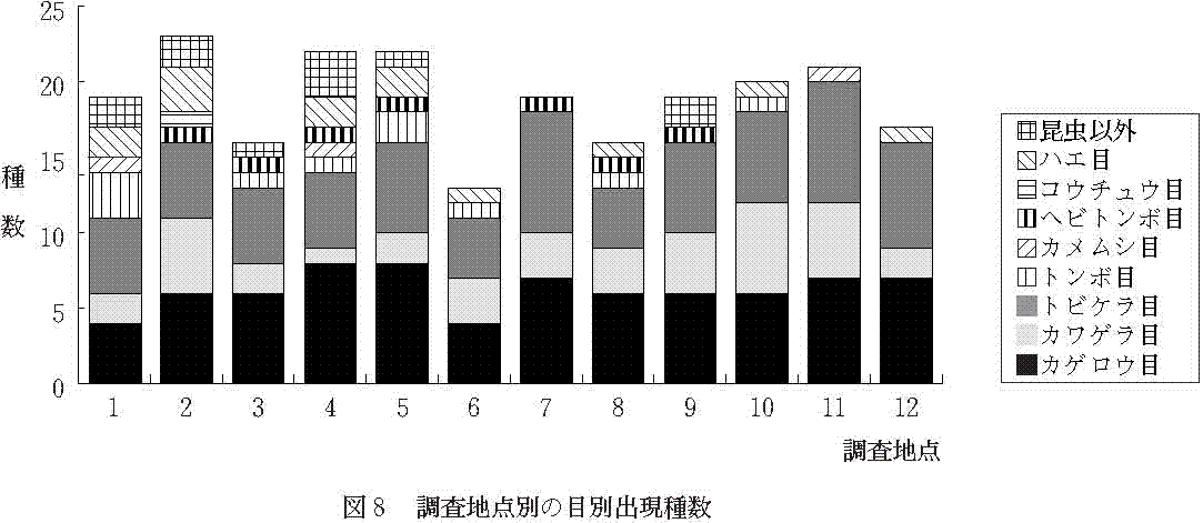 調査地点別の水生昆虫と昆虫以外の底生動物の出現種数を目別に示したのが図8である。これを見ると、最も種数が多い所は、平谷川の調査地点2で23種である。ここは、河床が安定していたから多くの種が採集されたものと思われる。調査地点3、6、8では、出現種数が13〜16種とやや少ない。これは、増水により水生昆虫類が流され、その後回復していない結果と考えられる。他の調査地点では、20種前後が採集されており、河床が不安定な状況にもかかわらず比較的多くの種が出現している。増水の影響がなければさらに多くの種が採集されたと思われる。