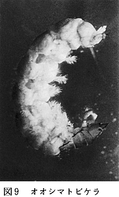 3)特記すべき種について 出現した種の中から希少であるとか、分布上特徴が見られる等の種について取り出して みたい。 ほとんどの調査地点に出現したのが、エルモンヒラタカゲロウ、コカゲロウ属の数種、ヒゲナガカワトビケラ、ウルマーシマトビケラである。これらは、県内の河川に普通に見られ、個体数も他の種に比べて多いものである。 1個所だけに出現したのは、キブネタニガワカゲロウ、キベリトウゴウカワゲラ、ノギカワゲラ、カワトビケラ科の1種、ミヤマシマトビケラ、オオシマトビケラ、ヒロアタマナガレトビケラ、コカクツツトビケラ、ヤマトビケラ属の1種、コバントビケラ、コオニヤンマ、シマアメンボ、ナベブタムシ、アメンボ、ヒラタドロムシ属の1種、ユスリカ科の数種、アブ科の1種であった。 オオシマトビケラ(図9)は、吉野川本川には普通に見られるが、半田川や貞光川のように水のきれいな川からは出現していない。穴吹川では、今回初めて採集された。また、ナベブタムシ(図10)は水がきれいな川に出現するが、採集例は少ないものである。ナカハラシマトビケラ、エチゴシマトビケラも採集例は多くなく、比較的きれいな川の中・下流域に出現する傾向が見られる。本来広く分布している種も、増水の影響で1個所でしか採集されなかったものも含まれているであろう。1個所でのみ採集された種は、全般に個体数が少ないものが多い。