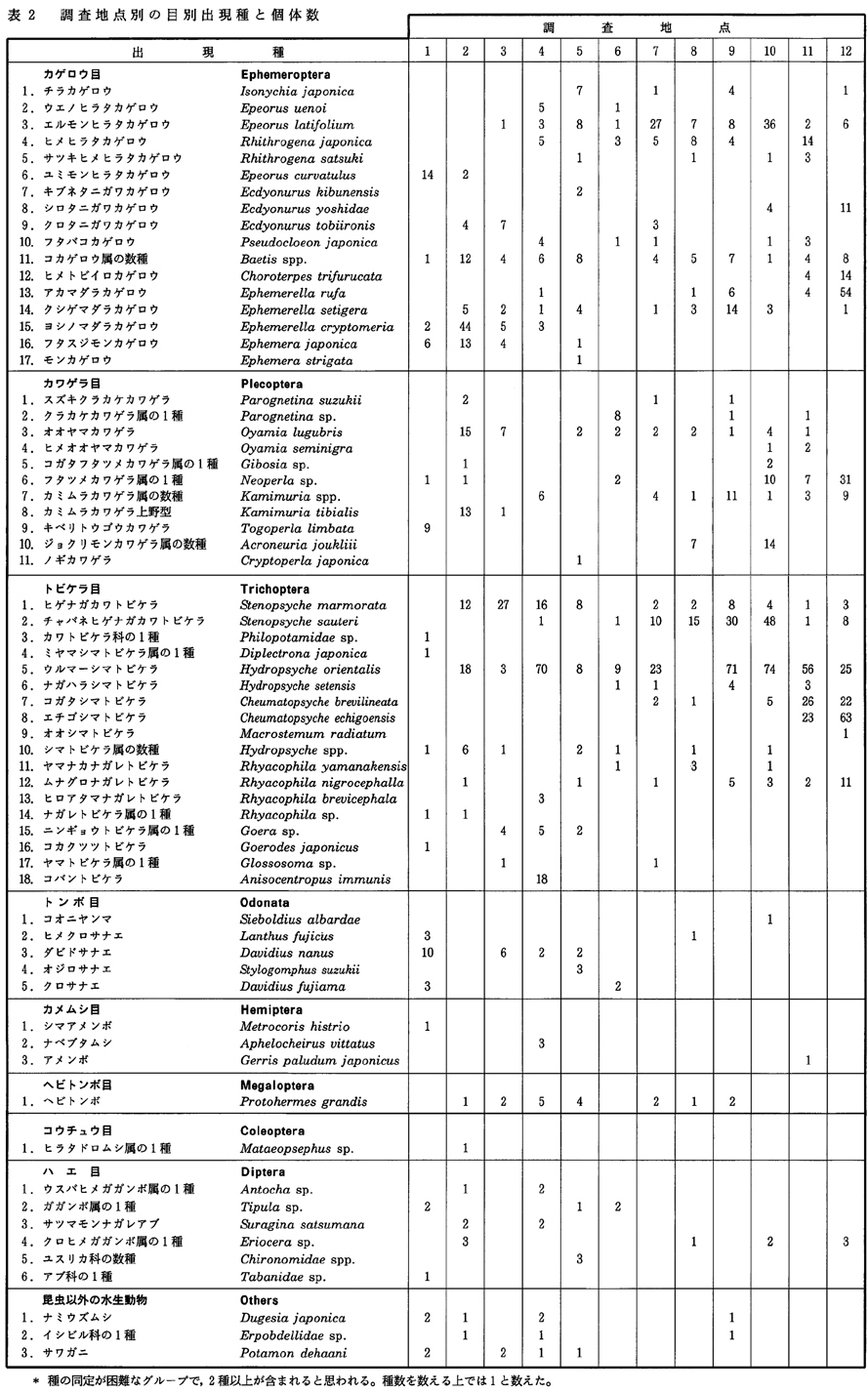 4)水生昆虫類からみた河川水質環境 これまで述べてきたように、河床状況が不安定であったにもかかわらず、20種前後の種が出現した所が多く、カゲロウ、トビケラ、カワゲラなどのように清水を好む種が多くを占めていた。また、ナベブタムシのような清水に住む、希少となりつつある種も出現しており、水生昆虫相からみても、調査水系の水質環境は良好である。