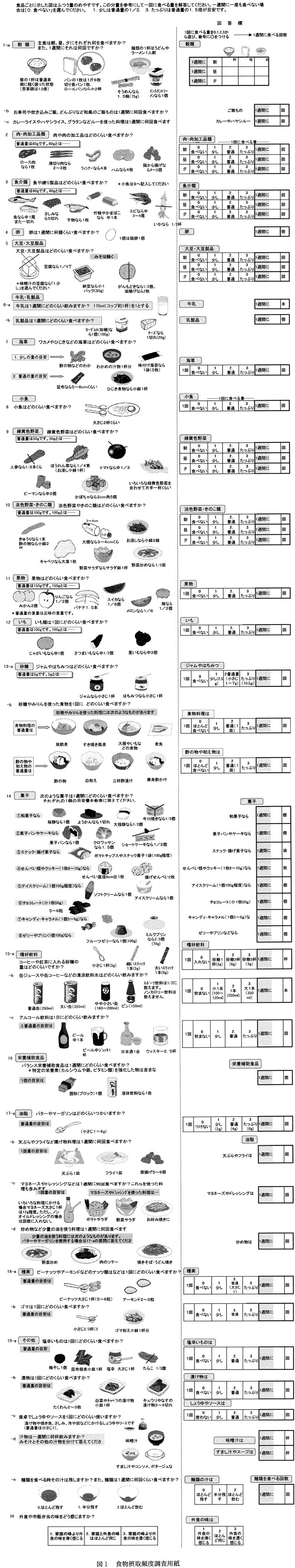 TBF-102)について測定した。栄養摂取状況調査では、我々が開発した食物摂取頻度調査用紙(4)(図1)を使用して1週間の食事内容について個別にたずねた。摂取量推定の精度を高めるためにフードモデル(川崎フードモデル)を用い、栄養素摂取量の計算には、日本標準食品成分表を内蔵したエクセル栄養君を用いた(5)。また調査時に持参してもらったみそ汁の塩分濃度は、食塩濃度計(堀場製作所HS-7)で測定した。