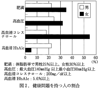 3.結果と考察 1)健康問題を持つ人の割合 図2に、健康問題を持つ人の割合を示した。肥満、高血圧、血清高コレステロールおよび糖尿病は、その原因が主に不適切な栄養による疾患である。肥満は、体脂肪率によって判定した。男性で25%以上、女性で30%以上を肥満とした。男性の22%、女性の35%が肥満であった。全国との比較のために表2に