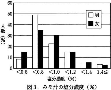 以下の摂取を推奨している。前述したように穴吹町民の高血圧者の割合は、全国よりもかなり低かった。しかし食事調査の結果では、穴吹町民の食塩摂取量は高かった(男性14.5g、女性14.7g)。それ故、食塩摂取量と高血圧の関係は矛盾していた。この矛盾は、食塩摂取量の計算にあるのではないかと考えられる。すなわち、食塩摂取量の計算は、日本標準食品成分表で行われるので、個人がどのような塩分濃度の食品を食べようと全員同じ塩分濃度として計算される。このように食塩の摂取に関しては、通常の計算では問題が大きいので、他の方法をとる必要がある。今回の研究では、みそ汁の塩分濃度を測定し、これから食塩摂取の過多と高血圧者の割合の関係について考えてみた。穴吹町住民のみそ汁塩分濃度測定の結果を図3に示した。塩分濃度が1%以下のものが男女で8割弱であった。日本人のみそ汁塩分濃度は、一般に1.0〜1.1%で、1%を切る地域は少ない(8)。また、徳島県下でも三好町では1%を越える人が65%以上であった(9)。このようなことから、穴吹町住民の塩分摂取量はかなり抑制されており、そのことが高血圧者の割合が低かった原因と考えられる。