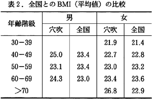 は身長の2乗当たりの体重から肥満を判断するもので、26.4以上が肥満とみなされる。年齢階級別に全国(6)と比較してみると、男性の各年代ではほとんど差はみられなかったが、70歳以上の女性で、全国より穴吹の平均値が高かった。