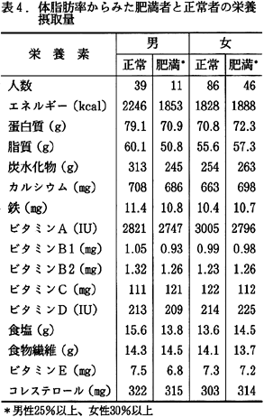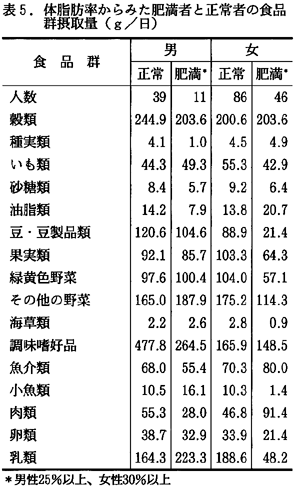 3)疾患別にみた正常者と異常者の栄養摂取量と食品群別摂取量 表4および5に、肥満者の栄養素摂取量と食品群別摂取量を示した。男性の肥満者は、健康に対して注意を払っているように思われた。すなわち、澱(でん)粉質食品、肉や魚の摂取量が低く、その結果エネルギー、脂質、炭水化物の摂取量が低かった。しかし牛乳の摂取量は高かった。これに対して、女性の肥満者は食生活に注意を払っている様子はみられず、食品群では魚類、肉類の摂取量が高く、その結果、エネルギーや脂質の摂取量が増加した。