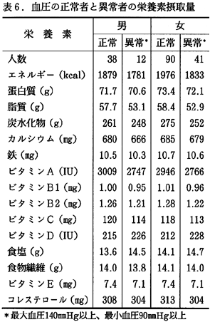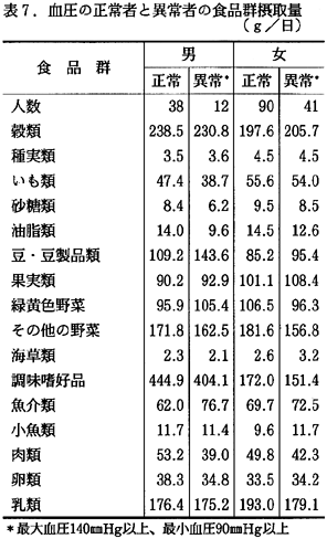 表6および7に、高血圧者の栄養素摂取状況と食品群別摂取量を示した。高血圧の食事上の最大の原因は、食塩の過剰摂取である。厚生省は10g