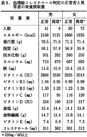 以上のものを異常(高血圧あるいはその予備軍)とした。穴吹では高血圧者の割合は男性で24%、女性で31%と、全国(男性45%、女性36.6%)に比べて低かった。 血清総コレステロール値は、220mg/dl