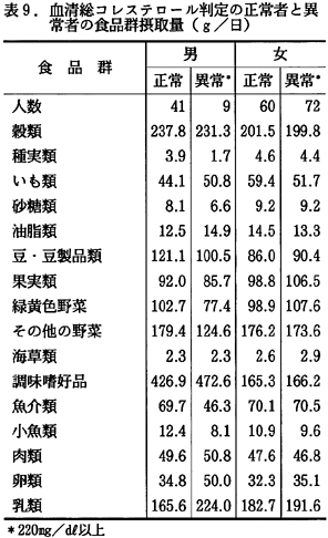 表8および9に、血清コレステロールの高値者の栄養素摂取状況と食品群別摂取量を示した。正常者、異常者間には特に目立った摂取量の差は見られず、高値者は、男女とも食事に対する注意が払われていないように思えた。女性対象者のうち、半数以上(55%)が血清高コレステロール者であったが(図2)、その6〜7割が60歳以上なので、年齢についても考慮しながら、栄養指導および運動指導を行っていく必要がある。