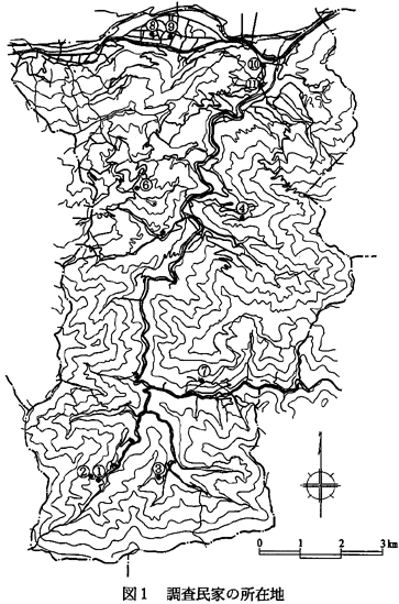 2.穴吹町の調査民家一覧(図1) 「山」の民家については、できるだけ様々な谷筋、敷地の向きの事例を収集するように努めたが、調査への協力が得られないケースもあり、多少の偏りを示している。 「川」の民家についても、調査協力が得られず断念した民家もあり、サンプル数は少なくなっている。 また、「まち」の民家のサンプル数が少ないのは、主に建て替えが進んでいて、絶対数が少ないためである。 しかし、各地域の代表的民家事例は収集できたものと考える。