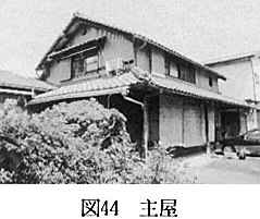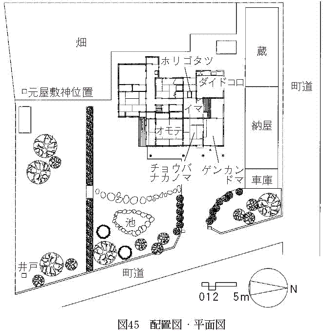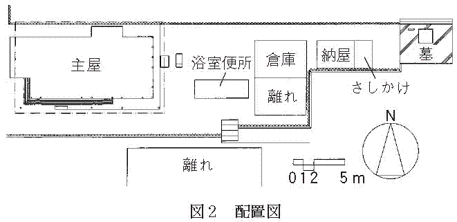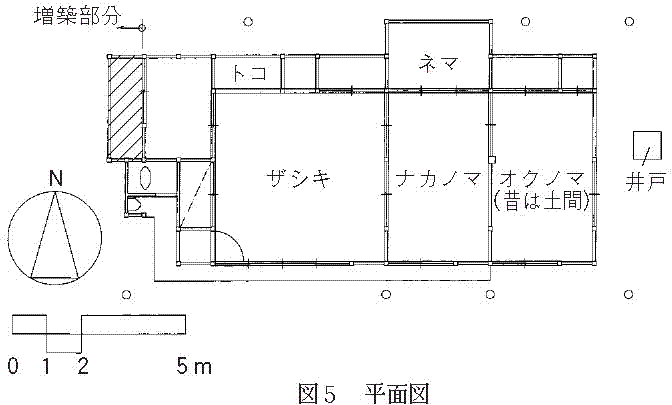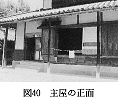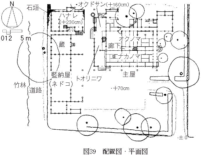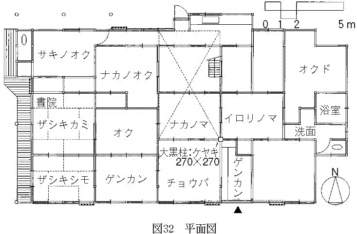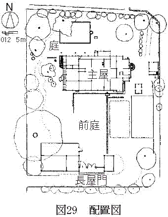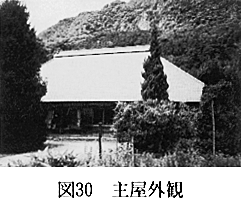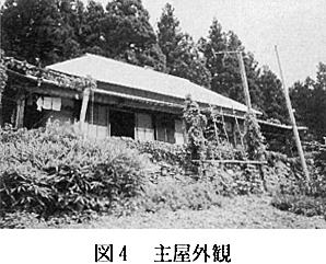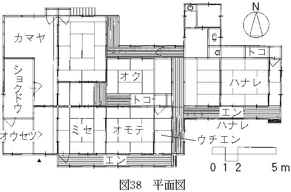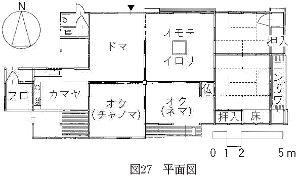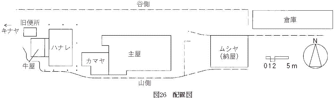 程の北斜面にあり、東から倉庫、ムシヤ、主屋・カマヤ・フロ、ハナレ、牛屋、少し離れてキナヤ(木納屋)が並んでいる(図26)。 北入り右勝手の主屋は「四間取り」で、外壁から半間入った本桁から奥行三間×間口六 間を有し、当地では「サブロク」と呼ばれている(図27)。井川町の「六8帖(むはちじょう)」とは違い、「オモテ」が12帖半あるなど、あまり規則的ではない。「オモテ」は竹の天井の上に塗り土を置いたヤマト天井である。建築は1800年ごろといわれるが、大黒柱の存在から実際はもう少し新しいと思われる。草が生え、こけむした屋根が印象的である(図28)。 現在、飲み水は谷(イズミ)からホースで引いてきて、カメ(昔は「ドウケ」と呼んでいた)にためているが、かつては体の前後に桶(おけ)を「カタイデ」水を運んできていた。 (阿部・東)