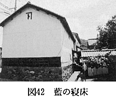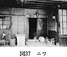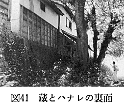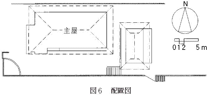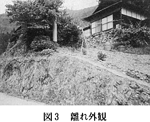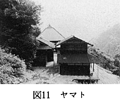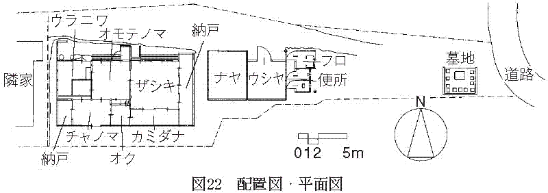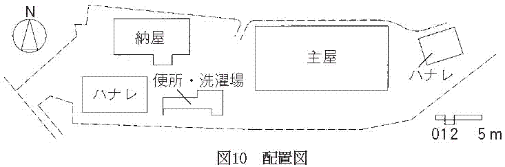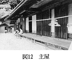 (3)田中 定枝 家 古宮字喜来155番地 喜来集落の車返から、杉木立の中の急な石段を上る。尾根後(じり)の開けたところにお堂があり、これよりさらに一筋小道を上ったところに当家はある。代々農家の家系で、寛永(1624〜44)や嘉永(1848〜54)を刻んだ墓がある。屋号は「オカタ」。家紋は「キリノトウ」。こんにゃくや麦、雑穀、みつまた、タバコをつくっていた。南斜面の青石積み段状敷地に、二層の「ハナレ」「ナヤ」「ベンジョ」「オモヤ」「ハナレ」が並び建つ(図10)。庭先は土地の不足を補うため、ヤマトをつくり、ハデをたてる(図11)。以前の主屋は、1800年ごろに建築され、明治以前に焼失した(葬式の夜に子どもがワラをとりにいって、持っていた提灯(ちょうちん)の火が燃え移ったといわれる)。現在の主屋は