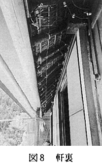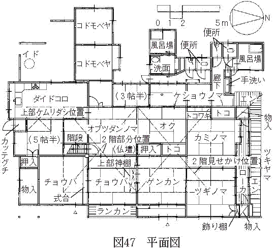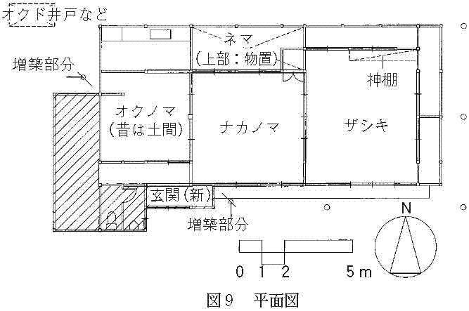 (2)中山 由太 家 古宮字内田3番地 当家は、前述の中山藤夫家と同じ山腹を、少し登ったところにある。やはり典型的な山岳部の民家の屋敷構えで、前面に深い谷を見下ろし、背面に山が迫る(図6、7)。屋号は「ナカ」といい、集落の中という意味らしい。宗教は神道で、屋敷神に南光院という山伏を祀(まつ)っている。 主屋は、1850年ごろに建てられたという事であるが、現在は西側に増築をしたり、建具をアルミに替えたりして、かなり手を加えられている。主屋の草葺き屋根は、昭和初期に葺(ふ)き替えをして、昭和50年代には鉄板で覆われたという事である。オブタはなく、軒裏は草葺きのままになっており、比較的状態は良い(図8)。間取りは、平入り左勝手の「中ネマ三間取り」であるが、「ネマ」の上(中二階)を収納として使っていたそうである(図9)。 昔、「オクノマ」は土間で、「オモテ」と「ザシキ」にはイロリがあり、天井は「竹スノコ天井」だったそうである。現在でも、柱、梁(はり)、板戸などは、重く黒光りしており、当時を物語る趣深い内観となっている。(高田)
