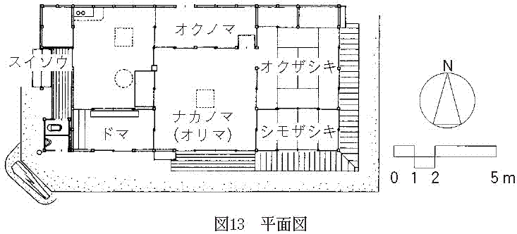 1883〜4年の建築(図12)。当初オブタはなく、茅(かや)の丸葺きであった。1951〜1952年ごろにオブタを増築。1991年ごろ、茅葺きをトタンで巻いた。かつて茅の葺替(ふきかえ)は集落の共同作業で行われ、40人位が3日間かかった(終戦直後の喜来の集落は約40戸である)。「喰違(くいちがい)四間取り」(図13)で、土間には天井がなく、小屋組が見える。土間奥は改造されているが、かつて、イロリやオクド、みつまたを蒸す釜(かま)・コシキがあった。「ナカノマ(オリマ)」は釿(ちょうな)はつりの梁・丸太根太が見え、スナコ天井になっている(図14)。小屋裏は7〜8尺の高さがあり、こんにゃく玉を保存したり、茅やタバコを置いた。かつて二間半角の板敷の真ん中にイロリがあり、1938年にお堂が建てられるまでは、集落の人が集まって踊ったりしていた。「シモザシキ」「オクザシキ」はいずれも畳敷に竿縁(さおぶち)天井である。(植村)