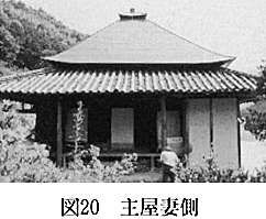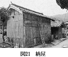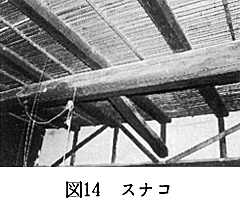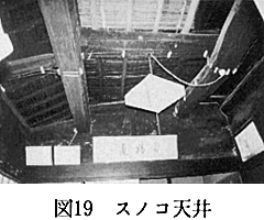 と高く、風格のある構えである(図18)。屋根は茅と麦ワラで葺(ふ)いているが、昭和50年(1975)ごろにトタンで巻いた。「スイジバ」は、その時に増築。以前はその場所に庇(ひさし)をかけ、クドがあったそうである。「ニワ」と「イロリノマ」には天井がなく、小屋組が見える。「オモテ」と「オク」はスノコ天井(図19)、他の部屋は竿縁天井である。「ザシキ」が妻側に開いているのが特徴的であるが(図20)、町内の比較的大きな「山」の民家によく見られた。主屋の一部と納屋の壁にひしぎ竹が張られている(図21)。(根岸)