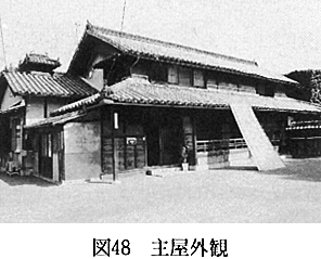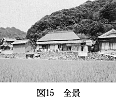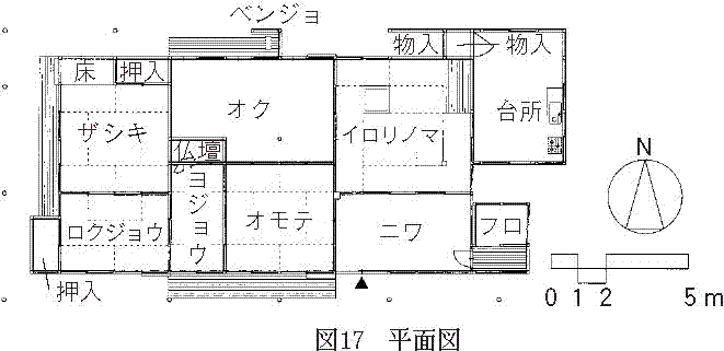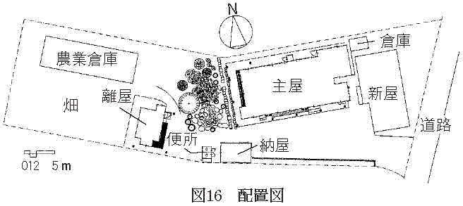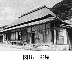 程青石を積んで地盤を高くしている(図15)。細長い敷地に新屋、主屋、納屋、便所、離屋(はなれや)が並ぶ(図16)。新屋のある位置には、最近まで牛小屋があり、二階にはワラを置いていた。離屋は昭和55年(1980)ごろ、タバコ乾燥小屋を改造したそうである。屋号は「トコンノウエ」。昭和40年(1965)ごろまでタバコを作り、養蚕も行っていた。 主屋の建築年は、家人によると、18世紀後期。四方オブタの下屋造で、桁行(けたゆき)七間半と広く、部屋数も多い(図17)。床高1.17m、軒高3.94m