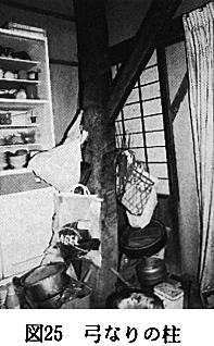 (5)大石 定雄 家 穴吹町口山字猿飼127 大石家は山間部北斜面に在る猿飼の集落の上部、新田神社近くにある。猿飼は30戸ほどの集落であったが、現在住むのは12戸で、住民の共同所有だった山も分配され、個人所有となっている。敷地は車道のカーブ地点から等高線に沿って西に入る。入ったすぐ左山側の墓地には、古い墓石も十数基寄せられている。当家は農家で、屋号は「引地」、家紋は「丸中の木」、屋敷神は「オフナトサン」を祀る。主屋は間口七間、奥行き三間半、右勝手「四間取り」の改造型であろう(図22)。「ベンジョ」が前面中央にあり、剣山系民家の特徴を示す(図23)。茅葺き寄棟屋根は昭和50年ごろトタンで覆った。主屋と東の納屋、西隣の緒方家の3棟の銀色塗装のトタン屋根が横に並び、遠くからでも視認出来る(図24)。 柱材は栗(くり)や杉で檜(ひのき)は一切使用せず、主に桜とホウソの木(ナラ)の白太を斫(はつ)り、赤身だけにして弓なりの材をそのまま使用している(図25)。それは堅くて、改造時に大工の鋸(のこぎり)の歯が立たなかったほどであった。また、釿(手斧)仕上げなどから建築年が古いことが推察される。当主の亡祖父の話では、かつて「オモテノマ」の床は竹簀(たけす)、「ザシキ」は板間に筵(むしろ)敷きだったそうで、客事だけに使用していたが、一時蚕を飼っており、場所の足りないときは「オモテノマ」まで蚕棚を作っていた。 すすけていた棟札を、「解読する」と寺の住職が持ち帰り、薬品で洗ったが字が薄くなり読めなかったそうで、そのまま寺から返っていない。建築は1750年以前と推測される。 東のナヤは明治初年ごろの建築で、昭和30年(1955)ごろ建て替えられた風呂(ふろ)棟が東に付いている。水は、昔は共同のイズミから得たが、今は個人で引いた谷水の水道となっている。(林)