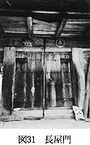 (7)緒方 忠亮 家 古宮字半平568番地 緒方家は、穴吹川上流、木屋平村近くの南向き山麓(ろく)に位置している。代々庄屋を務めており、脇町の稲田家とも1585年からかかわっていたことが古文書に記されている。 明治までは禄高(ろくだか)による生活であり、以後は林業、たばこや養蚕業を営んできた。屋号は「土井」、家紋は「丸に三角」で、この家紋は八幡神社にも彫られている。 屋敷内には、主屋のほかに長屋門があり(図29)、現存する主屋は、明治7年(1874)ごろに建替えられたもので、1950年後半に屋根の葺替え、1973年に茅葺きの上にトタンを巻いている(図30)。また、長屋門の建設年代はわかっていないが、主屋より古い。扉や金具が大きく社寺の門にも匹敵するが、屋根の茅葺きが撤去され、トタン葺きになっているのが残念である(図31)。 間取りは、庄屋としての仕事や接客としての「ゲンカン」「チョウバ」「ザシキ」、住まいとしての「ナカノマ」や「オクノマ」など9部屋と、通りニワを持つ大きな家である。家の者が使用する東の「ゲンカン」の上には、梯子で登り降りして使用する女中部屋があり、「ナカノマ」上の中二階は物置として使用されている(図32)。 (速水)