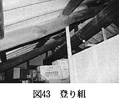 3)「まち」の民家 (10)一森 登 家 穴吹字辻31番地 屋敷は、伊予街道と木屋平街道の交差する場所に位置し、水運の要所でもあった。先祖は阿波町から移住したことが、阿波町谷島の明王院過去帳に記されている。代々の農家であり、藍のすくも造りを専業として、現在も藍の寝床が原形を留めている(図42)。今の当主で6代目になり、屋号は「カネト」で、家紋は「ツタ」を表し、屋敷神は「おたちさん」が祀られている。 主屋は東向きで、北側に藍の寝床と納屋が直線に並んだ配置となっている。納屋は現在鉄骨造に建替えられている。主屋は明治12年(1979)3月に上棟(棟札現存)した。二階小屋組は登り組工法(図43)で、下屋は四方屋根であったが、南西部の増築の為に原形はとどめていない(図44)。「ゲンカンドマ」より左方向に、「ナカノマ」「オモテノマ」と続いて内縁に至る。「オモテノマ」は本床と書院があり、栂普請(つがぶしん)といわれるぜいたくな造作が見受けられる。「ゲンカンドマ」より奥に向かって格子戸を通り、「ダイドコロ」「オクノマ」と各室が並んでいる。二階は一部、子供室に改造されているが、他の部分は原形のままで物置に使われている(図45)。 度重なる穴吹川のはんらんで被災しており、「ゲンカンドマ」の天井には、被災時に使う二階に通じる開口が設けてある。また、壁も洪水跡を隠すように板張りにして、意匠での配慮が見受けられる。(田渕)