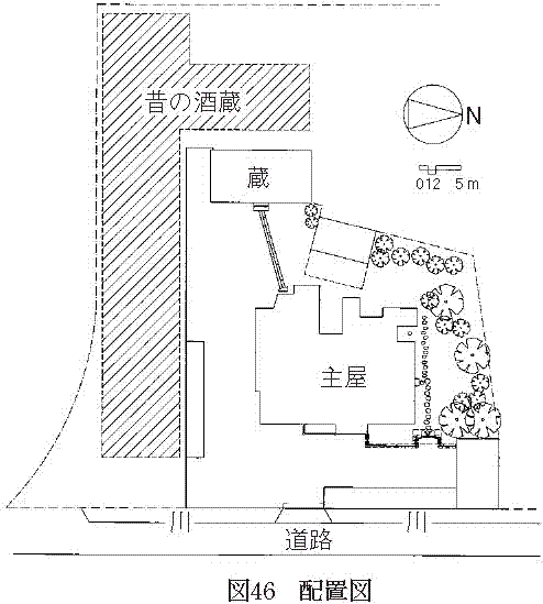 (11)佐藤 宏史 家 穴吹字平ノ内1番地 当家は地元で長年造り酒屋を営んできた家柄で、大きな敷地を有し、平成5年(1993)ごろまで営業してきたが、橋と取付道路新設のために酒蔵を取り壊すことになり、これをきっかけに廃業した。屋号は「サドヤ」、家紋は「マルナカノキ」。 取り壊された酒蔵は、大型で数棟に分かれた堂々たるものであったそうである。その中で最も新しかった酒蔵(これは、今の主屋と同年に建築されたもの)の鬼瓦(がわら)が新しい庭の一角に残されている。撤去された酒蔵や精米所を除いた敷地も依然広く、改造されてはいるが、蔵も2棟残っている(図46)。 主屋は大型の木造二階建て入母屋形式で、南西隅の切妻屋根の上には入母屋屋根の凝った煙出しが載っている。特に古いという建物ではないが、おおらかな感じを与える住宅で、家人によると建設年は大正元年(1911)ごろとのことである(図48)。 「ゲンカン」は建物東側中央に位置し、南東、東、北側には下屋が回り、主に西側に増改築が繰り返されてきている(図47)。 「ツギノマ」と「カミノマ」の間の欄間や釘(くぎ)隠しなどの金物の細工が立派であることや、来客専用の便所や風呂があることなど、繁栄をしのばせる間取りとなっている。 その意味で、「チョウバ」とその出入口が南寄りに別にあったり(今はこれが玄関として使われている)、二階部分の北半分が「見せかけ」になっているなど、町屋としては特殊解ではあるが、穴吹町の商業の繁栄を示す貴重な文化的財産と言えるだろう。(本田)