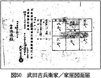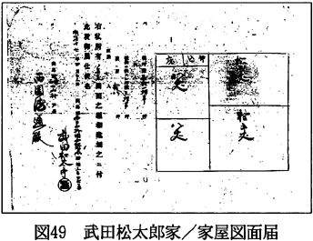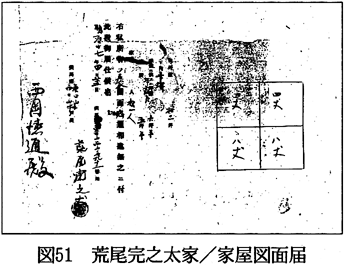 宛」で、各所帯主名で提出した体裁となっているが、筆跡から役所の人間が作成した書類に住人が署名押印したものとみられる。全83件の図面のうち、間取りがないのが5件、間取りはあるが徴発坪数などのデータがないのが1件、間取りもデータもないのが1件であった。 住所と氏名はほぼ判別できたが、現在の住所・家屋とは照合が困難である。部屋数はデータ全77件のうち、1部屋7件、2部屋21件、3部屋9件、4部屋36件、5部屋1件、6部屋3件で、4部屋と2部屋の家屋が多い。4部屋36件のうち田の字プランは33件で、明治17年当時には田の字四間取りプランが完成されて、普通の家屋でも当たり前に用いられていたのであろう。 総坪数で最も大きいのが武田松太郎家の四間取り21.5坪で(図49)、次いで武田吉兵衛家の六間取り20坪(図50)である。最小家屋として、一部屋3坪が2件ある。平均坪数は10.3坪/件である。家族数は平均5.5人/件。最大は前述の武田吉兵衛家の12人で、次いで荒尾完之太家(図51)の11人である。徴発坪数では、家族1人の寝所を0.5坪/人としているのが、全81件中65件ある。有事の際には、普通の家族は単純に一人畳一帖に寝て残りの部屋を兵隊に供出する、それぞれ事情のある家庭は一律の基準を適用しない、ということであろう。(田村)