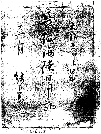 2.長州海陸日用記 次ぺージの史料は、元治元年11月9日、命令を受けた緒方桂が、下組分代官役、甲藤野右衛門ほか1名にあてたものである。日誌の第1ぺージは、この覚え書から始まる。 十一月九日於会所ニ御軍令御軍帳拝上被仰付御請書左之通リ 御請書之覚 今般御軍令御軍帳拝上被仰付奉畏、此段御請書申上候 已上 子十一月九日 緒方 桂 甲藤 野右衛門 殿 柏木 久左衛門 殿 夜、五ツ時飛脚到着、拝上夫■用意、組子共小家共々右之通候ニ付、何時事之程も難計候間、何レ非常ニ相心得用意罷在候様、相達候事 日記は表紙とも33枚の和綴(とじ)で、77日間の出兵記録である。以下要約して抽出する。