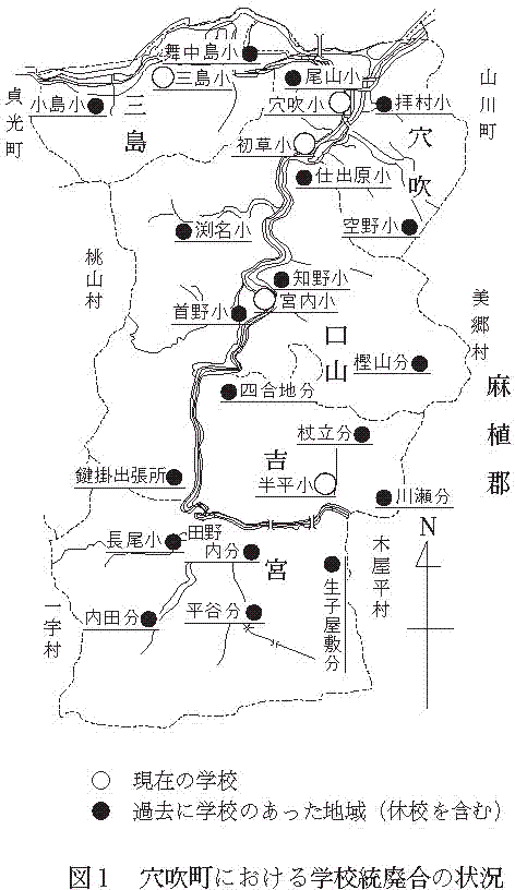 1.はじめに 明治5年(1872)に学制が頒布され、従来の寺子屋を廃して小学校を造ることになった。 「一般の人民、必ず邑に不学の戸なく、家に不学の人なからしめんことを期す」(学問奨励の被仰出書)という理想を掲げて出発した画期的な教育改革であったが、村自体にとっても住民にとっても小学校建設は大問題であった。学校の位置を決定することは、学校設立の第一条件であるが、子どもの通学距離のほかに、人口の分布状況、学校設置予定地の地形などの条件を考慮しなければならなかった。 穴吹町は穴吹川が町の中央を貫流しているので、橋の整備されていない渡し舟の時代には、大水の時は町が分断される格好になった。また、穴吹川の上流は傾斜の急な四国山地であるため、狭い地域のなかで農林業を共同作業によって行い、地域外の人との交流が少ない状況のなかでの生活が多かった。とくに女性、子どもにはこの傾向が強く、日常会話の「なまり」までも地域によって異なり、そのために分校の子どもが本校へ行きたがらない傾向があったほどである(「半平校の百年」)。 このような状況のなかでの学校の設立は、解決しなければならない条件が多く、学校が設立された後も、児童数の増減、交通事情の変化や政治的配慮も加わって、合併・統合・休校が頻繁に行われ、できれば低学年用だけでも地域内に設立してほしいという人々の希望を配慮して、数多くの分校・分教場が設立された。