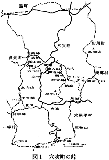 を超す高い山々で囲まれている。 交通路は、吉野川に沿って国道192号とJR徳島本線が東西に延び、また穴吹から国道492号が穴吹川に沿って南に延びて木屋平村に達している。 穴吹町の地図を見るとわかるように、山地を越える他町村との道路は、口山から貞光町家賀に通じる県道と、古宮から木屋平村谷口に通じる林道があるのみで、道路の開発が遅れていることがわかるが、逆に言えばそれだけ古い峠道が残っていることを示している。 今回の調査は、徒歩が主な交通手段であった時代の峠道に焦点を当てて、そのルートと現状、峠に残る石造物を明らかにするために行った。現地調査は、平成10年7月28日から12月6日までの間の11日間である。
