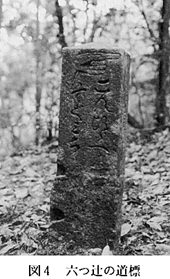 (3)中道(荷馬車道)180m 郡道(六尺道)としてつくられ、明治の末、自動車道が下に出来るまで使われた。壁側の崩壊で一部通行不能だが、峠部分はよく残っている。石造物はない。 (4)国道(自動車道)120m 明治36年(1903)から45年(1912)にかけて大改修された。「恋人峠」という名が付いたのは戦後のことで、近年若いカップルが恋の成就を願って、フェンスに鍵を掛けることで有名になった。現在国道482号線が通る。「明治四十二年(1909)二月二十一日安置 首野名中」の銘がある大師像が鎮座する大師堂がある。 なお、峠名の由来については、国道沿いの説明板にある平家落人説のほかに、首野の藤川義夫氏(74)が、昭和27、8年ごろたばこを出荷する際、屋号の「コエト(越途)」を「恋人」と書いて出したことから、「恋人」の名が広まったという話を聞くことができた。 3)六つ辻(320m)と左手の石造物 峠らしい名前でないが地形的には峠で、五つの道が交わっている。ここに、「こんぴらへ すぐみち 孫右衛門 弥太郎」の銘のある道標(図4)が立つ。これは、讃岐の金比羅への道しるべで、古宮、鍵掛(かいがけ)から左手、拝立を経て六つ辻に達し、梶山峠を越えて家賀(けか)から貞光へ出て、三頭越から讃岐に入る金比羅参拝ルートがあった。