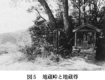 の大師像もある。 4)梶山峠 梶山と貞光町家賀を結ぶ峠で、首野、梶山から貞光へ出るのに使われていた。県道端山(はばやま)調子野線が峠を通っており、峠の手前に道路の完成記念碑がある。 5)地蔵峠(図5)510m 支納と貞光町家賀を結ぶ峠で、支納峠ともいう。「子供の時から、貞光へよく買い物に行った。旧暦4月の9、19、29と9のつく日に立つ市に出かけて、農具や生活用品などを買って帰った。片道2時間はかかった」と、支納の向井昌利氏(74)が話してくれた。昭和62年(1987)、峠を南北に貫いて林道内田小島線が通じたため、峠の様相は一変した。峠には、造立年代はないが2体の地蔵尊があり、古い方は首が欠けている。