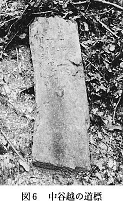6)中谷越 840m 古宮から北又を経て峠を越え、端山、貞光へと通じていた。また峠から稜(りょう)線を北に登ると友内神社のある友内山に通じる。峠には、「右 友内山 左 端山 こんぴらか(嘉)永二年(1849)八月吉日 寛勝」と、方角を示した手形が刻まれた緑色片岩の道標(図6)が残っている。この道標には、山、村、神社の名が並んでいて、書体も楷(かい)書から草書まで使われており、さらに手形が線刻でなく凹状に深く彫り込まれているなど、他では見られない特徴を持っている。
