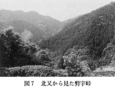 「古宮と端山は姻戚(せき)関係が多く、峠を越えてよく往来した。たばこ、こんにゃく、炭などの産物を出荷し、帰りは食料品を買って帰った。友内山は参拝者が多く、子供のころからよく行った」と、谷奥一敏氏(77)が話してくれた。 7)剪宇峠(図7)861m 北又と一宇村剪宇(きりう)を結ぶ峠。昭和48年(1973)、この峠の穴吹側で大蛇を見たという話が広まり、大蛇騒動があった峠として有名である。V字形の典型的な峠の形をしており、杉の大木もあるので、麓(ふもと)から一目で峠と確認できる。明和9年(1772)と弘化4年(1847)造立の2体の大師像と、「嘉永三年(1850)羽根切惣氏子中」の銘がある常夜灯がある。いずれも一宇側にあり、剪宇の人々によってまつられている。