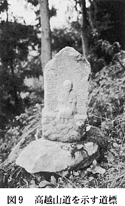 北の町道沿いには、役の行者像を浮き彫りにした道標(図9)がある。それには「(右)新名峠迄二十丁 左高越山エ五拾八丁 明治二(1869)巳十二月吉日」とあり、施主名は「柳作」は読めるが、出身地は読みとれない。