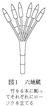 4.葬式 葬式の日取りは、寺の住職と火葬場との相談で出棺の時間を決めた。土葬は太陽を避け、夕方にかけて行っていた。僧に戒名(かいみょう)を与えてもらい、読経中に焼香し、引導を渡してもらう。棺のふたは石を拾ってきて打ちつけ、縄で縛った。 棺桶を担ぐ青竹は「さか棒」にし、根本の方が「先棒(さきぼう)」で孫が、「後棒(あとぼう)」を出里の甥が担ぐと仏が喜ぶと言われている。「位牌(いはい)持ち」は跡取り、「テンガイ持ち」はその家の一番主になる人(本家の長老など)が受け持ち、この人たちが三角の白い紙に梵字(ぼんじ)を書いたものを頭に結び着け、わらぞうりを履いた。「出立ちの酒」を飲み、葬列を整え寺の庭などの斎場に向かって出発した。飾り物を持つ役は、葬式を取り仕切っている人が名前を呼び上げた。庭には「六地蔵」が祀(まつ)られ(図1)、棺は庭で3回半回って葬列は出発する。その時、戸口でわら火をたき、死者の使っていた茶碗を割る。