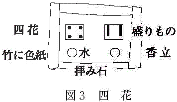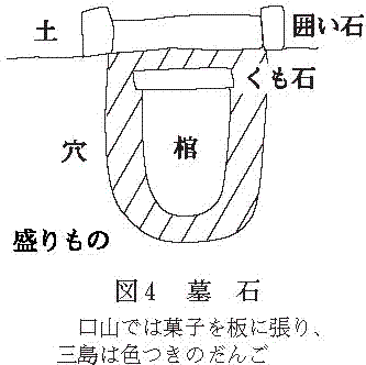 埋葬 血縁・近親者が火葬場に行く。土葬では、そのまま墓地へ行き穴に納め、一枚石を置く(地獄石 くも石ともいう)。土をかけ、囲い石と拝み石を置き、四花、盛りもの、香立て、水入れを載せる(図4)。一周忌までに拝み石を取り、石塔を建てる。火葬場が出来るまでは穴を掘って「ぼた焼」をしたという。まきを荷車で10把ぐらい積んで行き、骨にしてもらった。墓地や火葬場に棺を担いでいくのは近隣の人だった。葬列に使った飾り物は、谷に捨てるか焼き捨てるかした。