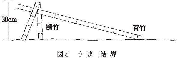 葬式の後 きよめ(塩祓(はら)い)をした。家の入り口に置かれた竹で作った「うま」(結界)(図5)をまたぎ、塩水で手を洗って清めた。今も三島地域では行っている風習である。