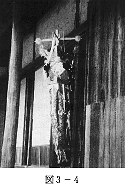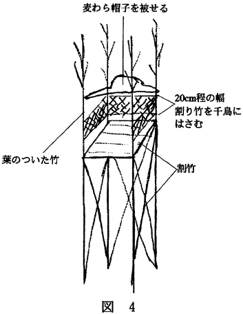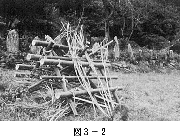 穴吹地区岩手と同様な例が、「穴吹町誌」(穴吹町誌編さん委員会,1987,1182)に記載されていることから、かつては、新仏とは別の先祖のまつり方が広くあったと考える。 特記したいのは、口山地区でみられる棚に麦わら帽子をのせる例、穴吹地区で蓑笠(みのかさ)をかぶせる例がみられることである。口山の麦わら帽子については、穴吹で語られているように、かつては笠であった可能性が高い。この蓑笠について葬送儀礼の中に類似点が見いだされる。葬送儀礼において、死日あるいは死後6日目に「カリヤ」もしくは「ムイカダナ」と呼ばれるものをつくり、それに蓑笠を使用する例が、東祖谷山村、西祖谷山村、池田町、木屋平村、神山町、穴吹町で報告されている。例えば、穴吹町半平では通夜の時までに「カリヤ」と呼ばれるものを家のカドにつくり、その形態は青竹で3尺ほどの高さになるように三脚を組み、蓑と笠を着せるという(近藤,1982,230〜243)。蓑笠が何を意味するのか判断できないが、口山、穴吹地区の盆棚の形態は、葬送儀礼の「カリヤ」との関連が考えられる。さらに、穴吹地区岩手で、盆棚と同様の形態と名称を持つ棚を葬式の時にも立てていたという例がみられることから、古宮、穴吹地区の盆棚は、葬送儀礼に立てる棚と共通のものといえる。この点からすると、穴吹町でみられる盆棚は、亡くなって間もない故人の霊をまつるためのものと考えられているといえよう。