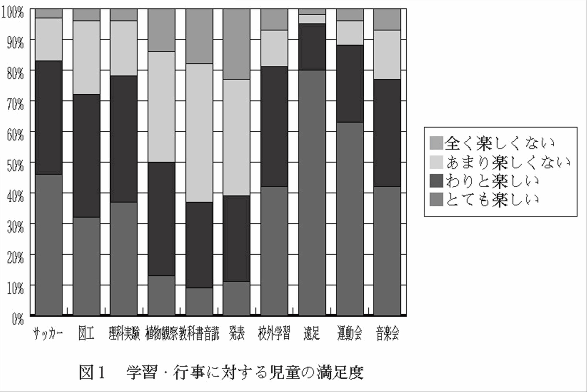 3.調査・研究の結果と考察 質問紙調査の単純集計の結果から明らかになったことを、いくつか考察していくことにする。 学校での学習・行事に対する児童の満足度を4段階に分けて回答させた調査では、当初予想されたように、サッカー、ポートボールなどの球技系の満足度が、「とても楽しい」・「割と楽しい」と回答した者が合計で80%を超えており、最も高く、理科実験・図工における絵画がそれに続き、70%を超えており、教科書の音読や、発表などは、「あまり楽しくない」・「全く楽しくない」が、「とても楽しい」・「割と楽しい」を上回っている(図1)。一般に中学、高校では、座学系の授業と、体験・実験系の授業の満足度の差は縮まる傾向にあるが、小学校高学年の段階では体験・実験系の授業の方が楽しいようである。さらに、校外学習・遠足・運動会・音楽会などのリクリエーション系の行事では、楽しいと感じている子の方が圧倒的に多い。