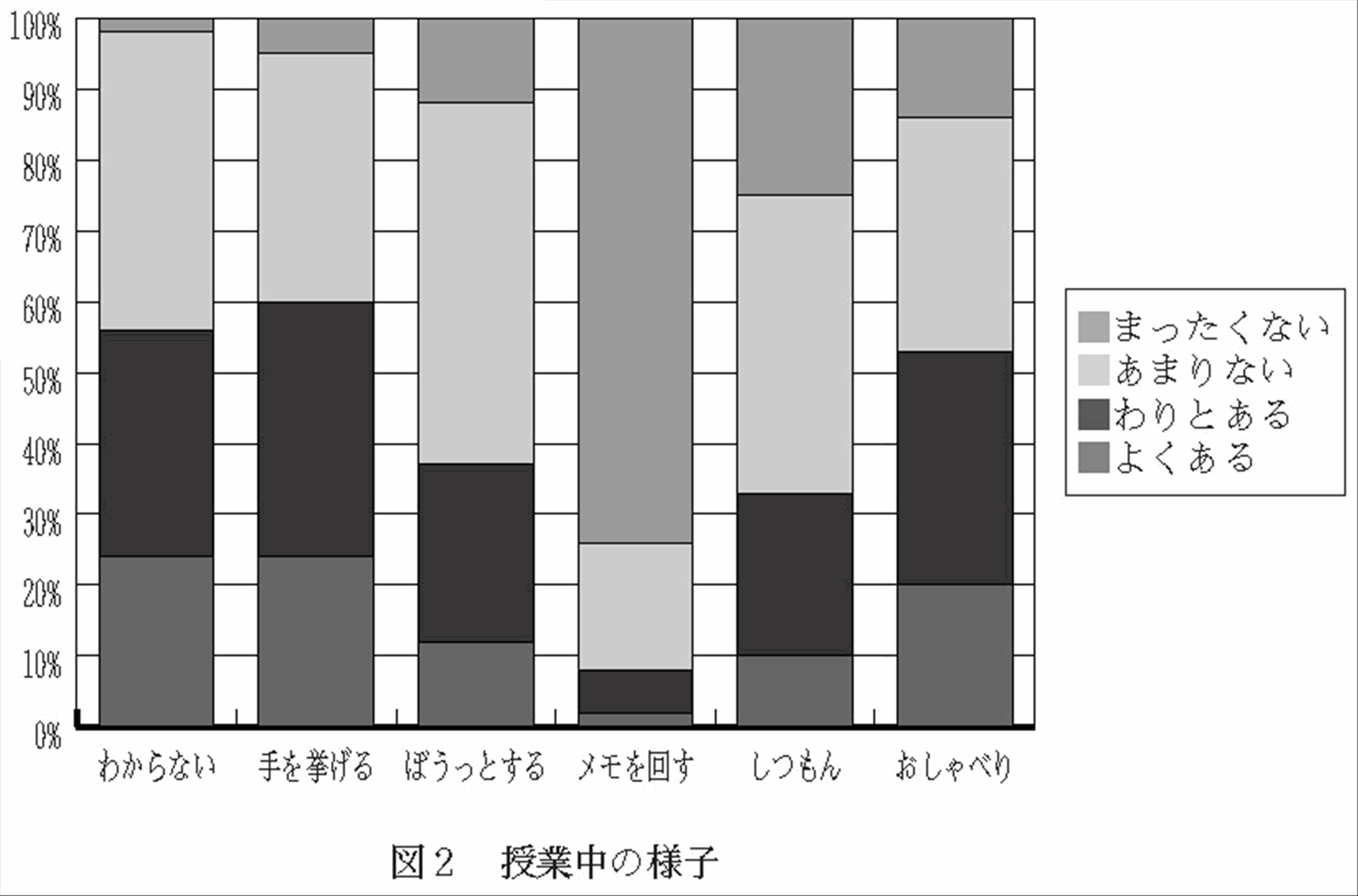 次に、授業中の様子を尋ねた質問では(図2)、むずかしくてよくわからなかったことが、「よくある」・「割とある」と回答した者が、「あまりない」・「全くない」をやや上回っているものの、自分から進んで手を挙げて発表したことのある者の割合も、「よくある」・「割とある」が 「あまりない」・「全くない」を上回っている。授業中わからないところを先生に質問する児童は、「あまりない」・「全くない」が合わせて67%で、「よくある」・「割とある」をかなり上回っているが、授業を聞くことができずにぼうっとすることや、授業中手紙やメモを回すなど、授業に参加しないことに関する質問では、「あまりない」・「全くない」が「よくある」・「割とある」を大幅に上回っており、授業中に関係のないおしゃべりをすることはあるけれども、授業に対する態度は少なくとも自己申告のレベルではおおむね良好であることがうかがえる。大阪などの大都市圏では、学級崩壊といわれる現象が頻発し、授業それ自体が成立しないという深刻な事態が発生している。しかし、この結果をみる限りにおいては、このような傾向はここではまだ見受けられない。