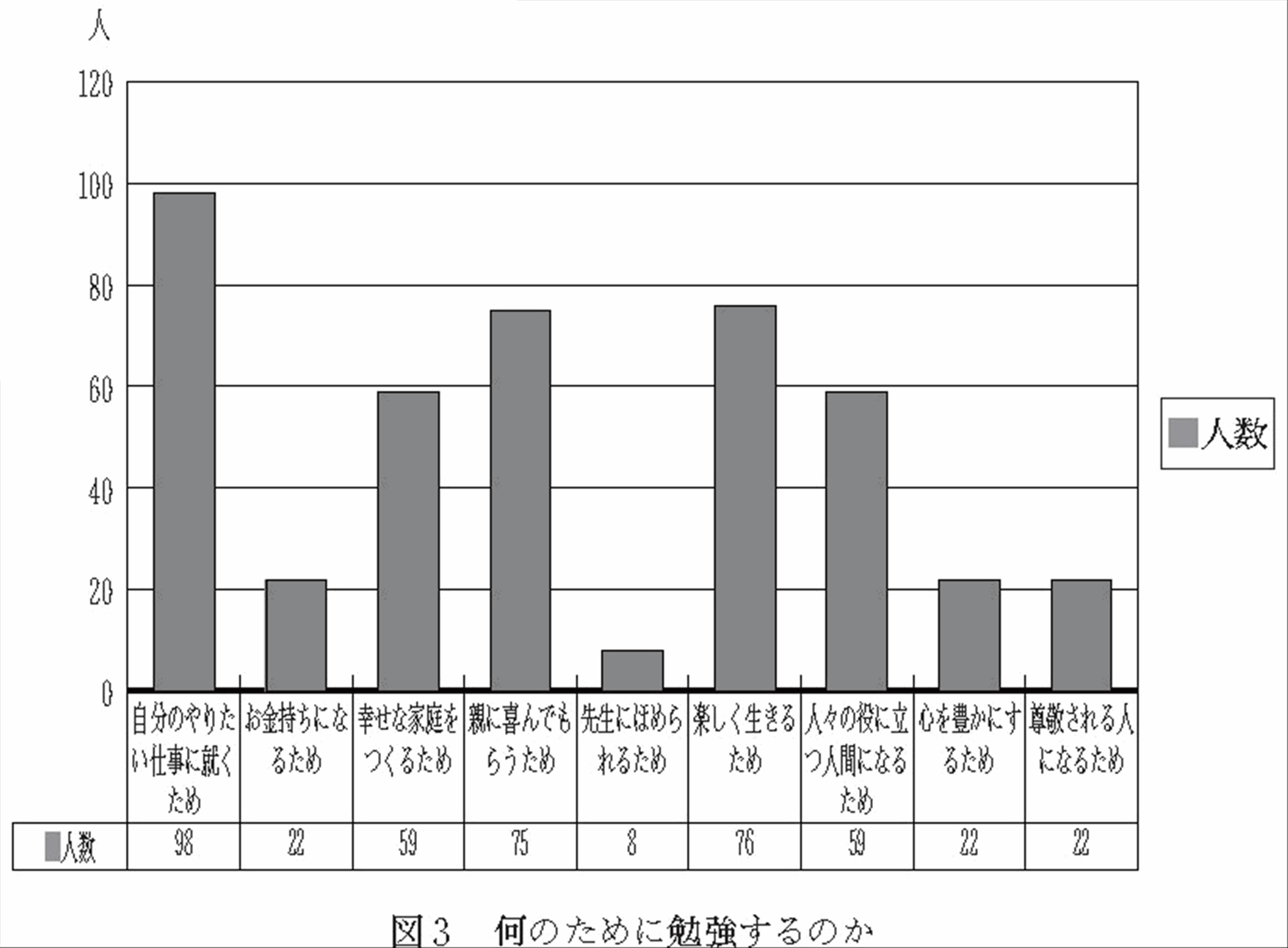 さらに、なんのために勉強をしているのかという複数回答を含めた質問では(図3)、「自分のやりたい仕事に就くため」が合計で98人と圧倒的に多く、「楽しくいきるため」76人、「親に喜んでもらうため」75人がほぼ同数で続き、「幸せな家庭をつくるため」59人、「人々の役にたつ人間になるため」59人が全くの同数で並んでいる。この結果から小学校高学年では、社会に対する信頼感、および自己効力感が十分に機能しており、自分の勉強に対する努力が、将来自分の仕事に結びつき、社会に貢献することができるという思いが内面化されていると理解しても差し支えないであろう。