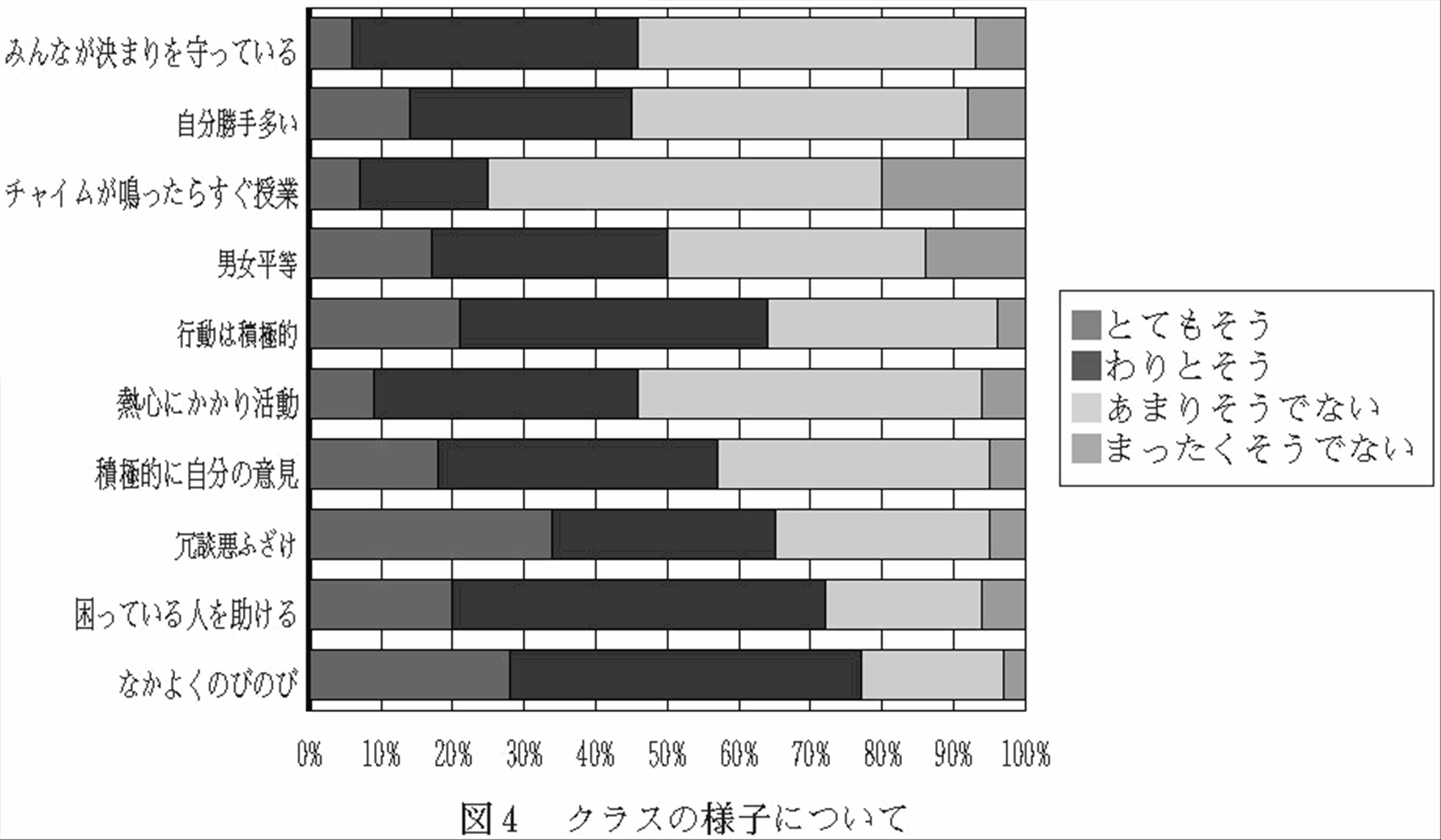 クラスの様子を尋ねた質問項目の単純集計を検討すると(図4)、「みんな仲良くのびのびしている」・「困っている人をみんなで助ける」に関しては、「とてもそう」・「割とそう」が過半数を占めていて、人間関係に関してはおおむね良好であると判断されるが、「熱心に係り活動や掃除をやっている」においては「あまりそうでない」・「全くそうでない」が「とてもそう」・「割とそう」を若干上回っており、「チャイムが鳴ったらすぐ授業が始められる」では、「あまりそうでない」・「全くそうでない」が「とてもそう」・「割とそう」を大幅に上回っている。さらに「自分勝手な人が多い」では、「あまりそうでない」・「全くそうでない」が「とてもそう」・「割とそう」を若干上回っているが、「みんながきまりをよく守っている」では、「あまりそうでない」・「全くそうでない」が、「とてもそう」・「割とそう」を若干上回っている、という結果が表れている。