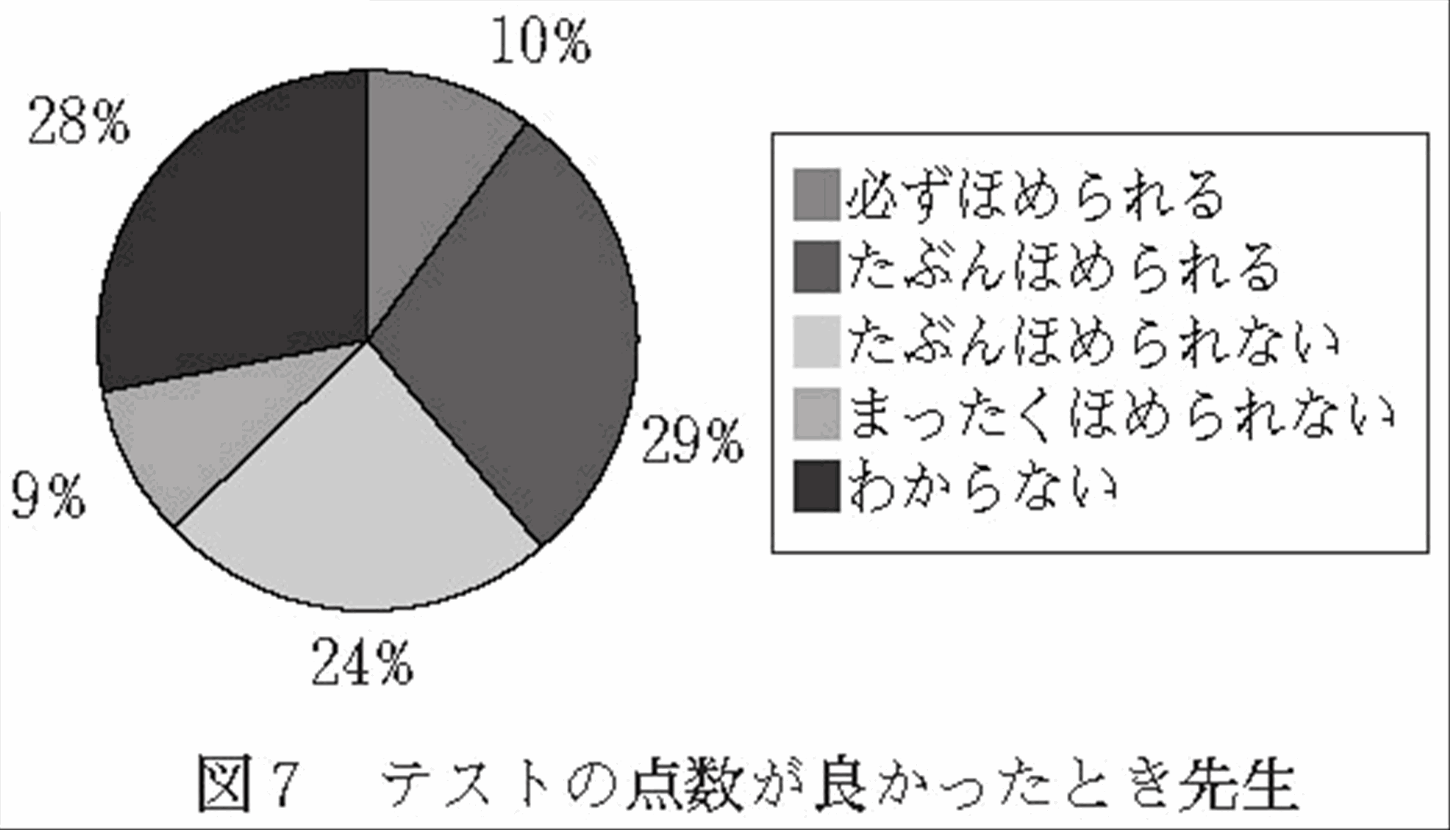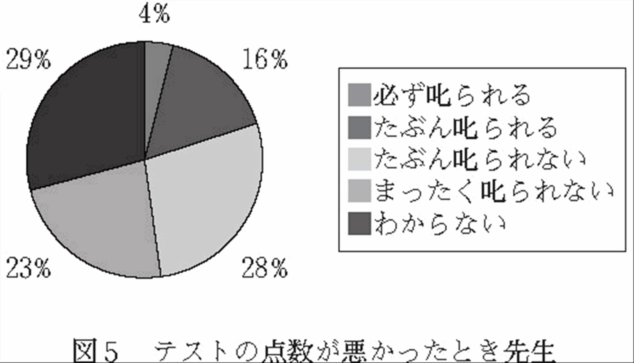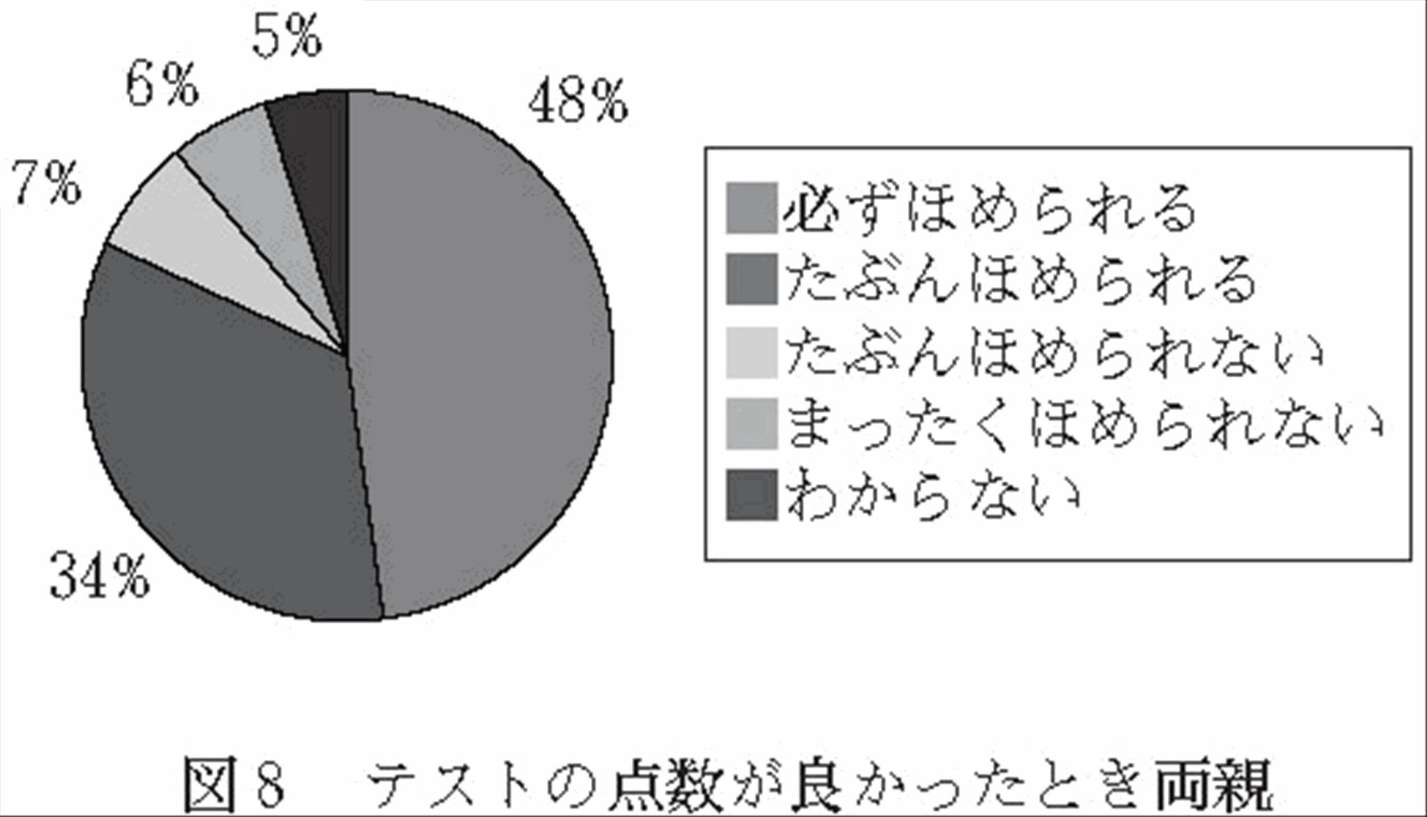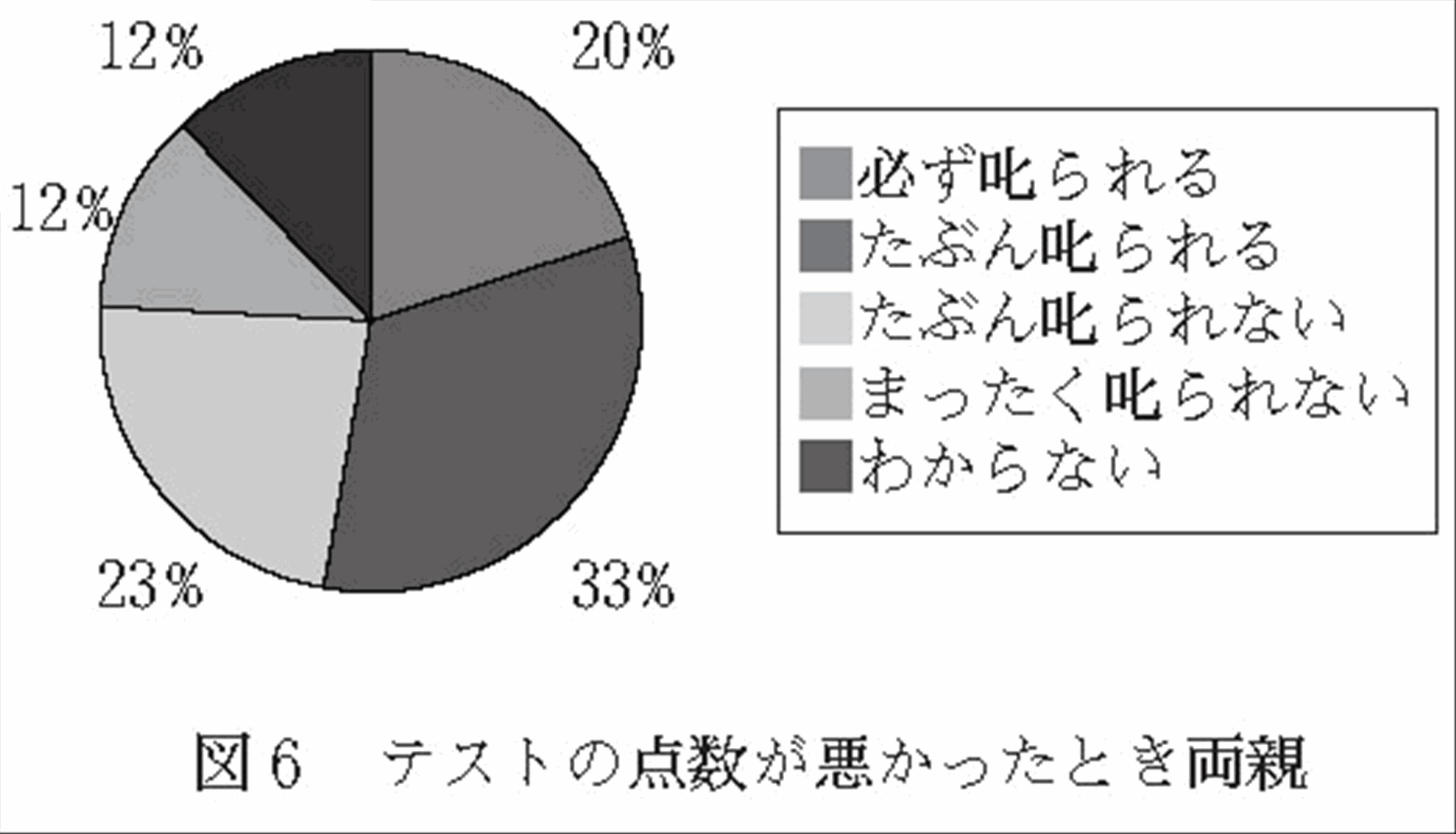 級友同士の私的な人間関係が良好であると見受けられるのに対して、係り活動や始業の態度などの、公的領域における行為に問題があると感じている児童が多いことが印象的である。従来は、子供の成長とともにその行動も公共性を帯びてくると考えられていたが、児童相互の印象では、自分勝手できまりを守らないと感じている生徒が過半数を上回っている。これは、私的なエゴが公共性を浸食しつつある兆しと見ることができるのではないかと思われる。 さらに、同様なことをした場合、先生から叱(しか)られる場合と両親から叱られる場合を比較した。 注目すべきは、テストの点数が悪かったとき先生からは「必ず叱られる」・「たぶん叱られる」がそれぞれ、4%、16%で、半数以上が叱られないと思っているのに対して、同様の質問に、両親からはそれぞれ20、33%で、大多数の児童が叱られると考えていることである(図5,6)。先生はテストの点数に関しては、必ずしもほめることもしないが、まして叱るということはまれなことである。しかし両親の場合は、点数が良かったときはおおいにほめるが、また悪かったときも叱るのである(図7、8)。つまり、テストの点数に敏感に反応するのは、先生よりも両親なのである。テストの点数という序列のはっきりしたことに対して、教師はどちらかというとあいまいな態度をとり、両親ははっきりとした姿勢を見せる。これはテストの点数による抑圧・圧迫という批判に対して教師は過敏になっているためと想像することができる。また一方、現実の点数の前に子どもたちをしった激励するのは両親であるという事実は興味深い。できれば序列付けを回避したいというのが教師の本音であり、わが子に高い成績を望むのが両親である。したがって、教師のあいまいさがかえって明確な評価を求める両親の競争心を過熱化するのである。