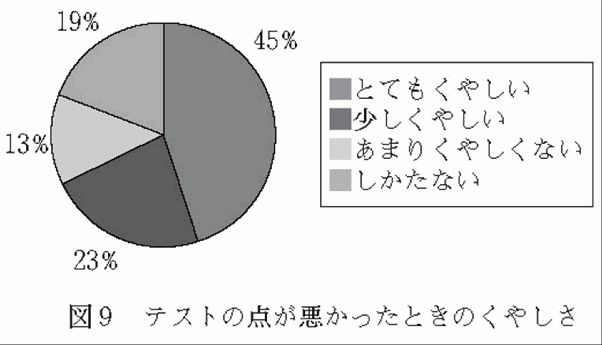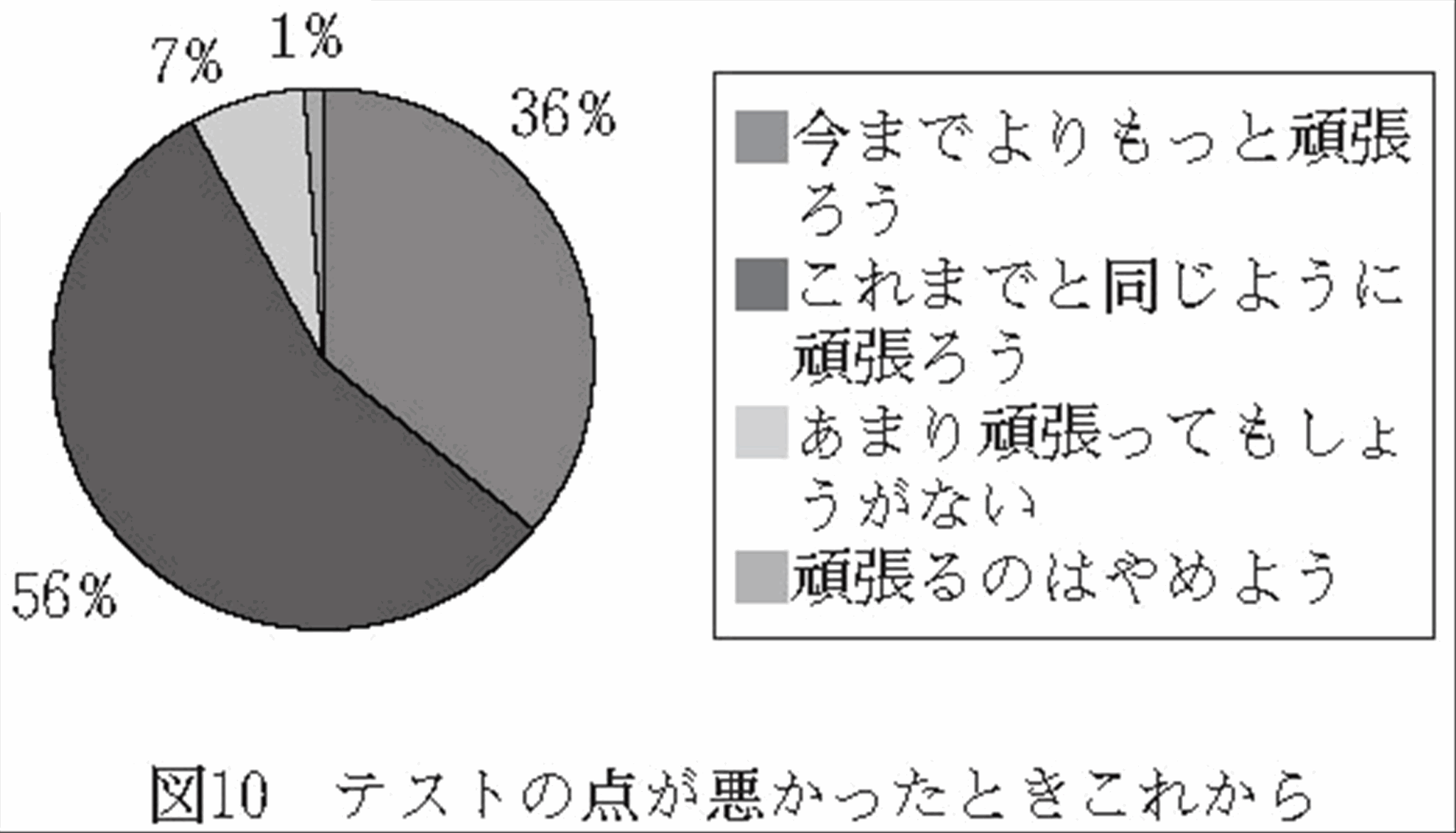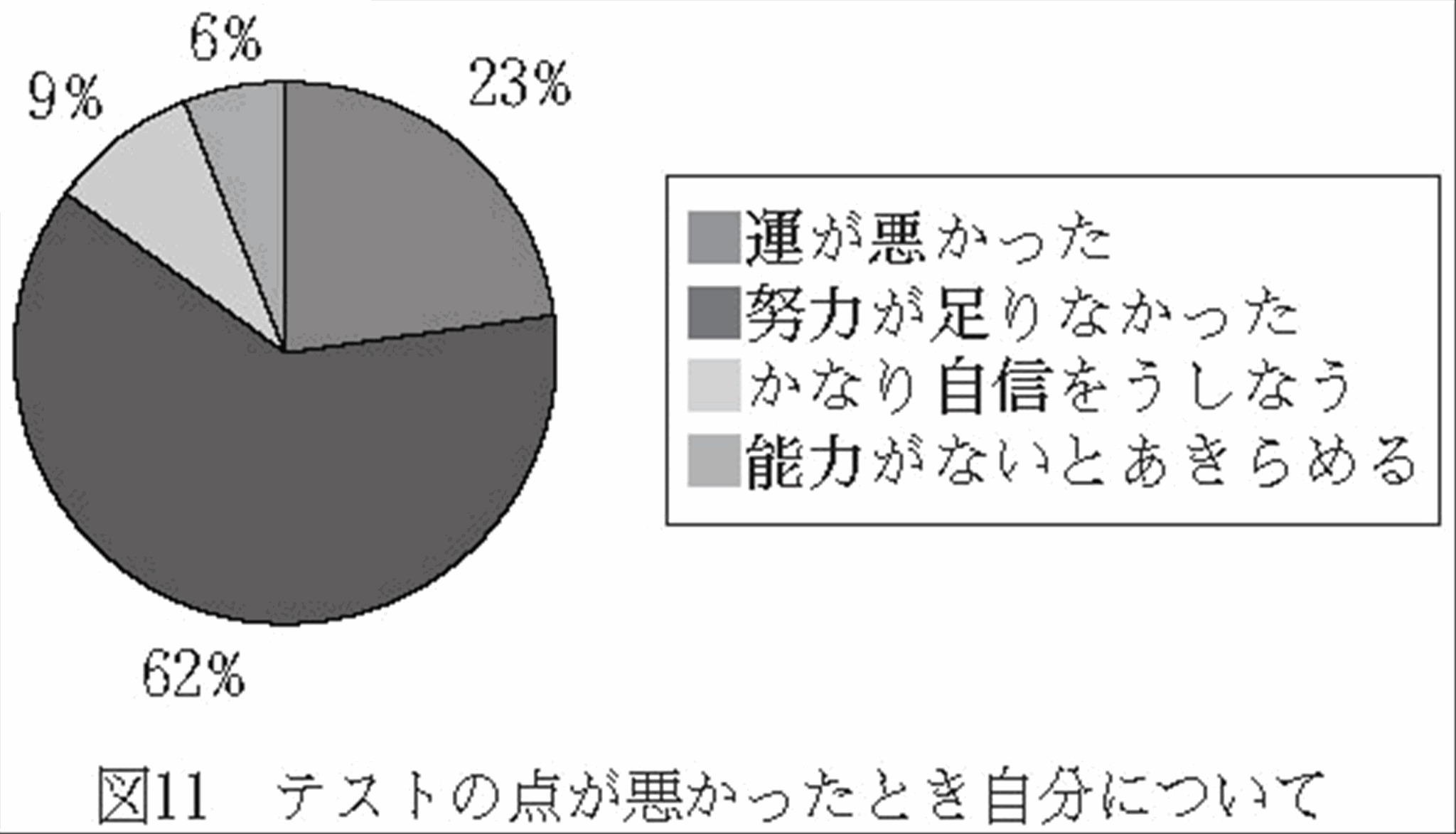 しかしまた一方、一生懸命勉強したテストで思い通りの点数をとれなかったときの感じ方を尋ねた質問では、「もっと頑張ろう」と「これまでと同様に頑張ろう」が圧倒的に多く、「運が悪かった」・「努力が足りなかった」という自己認知が、自信喪失や能力不足というあきらめの感情をはるかに上回っている。テストの点数にたいする自己評価は、いわば健全であり、原因帰属も自己の努力に帰している点では、自己効力感を喪失していない。