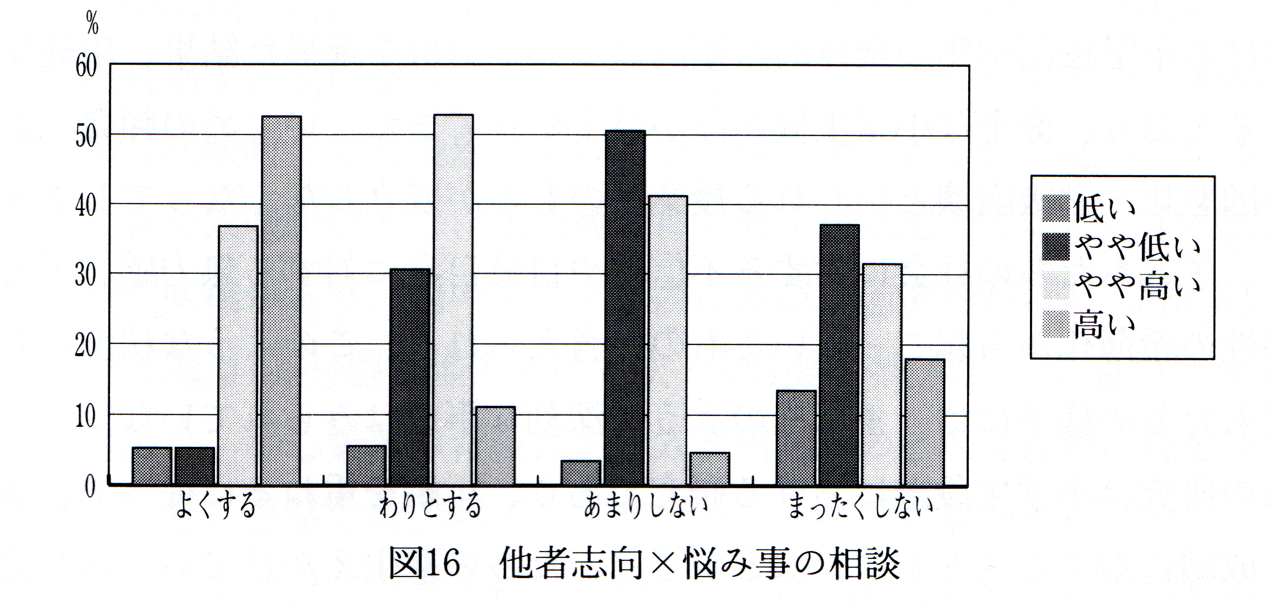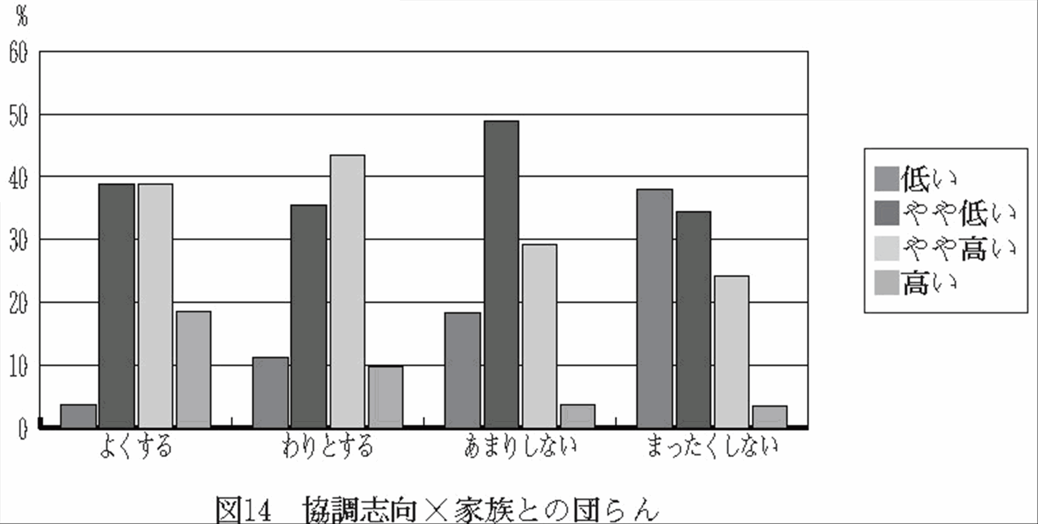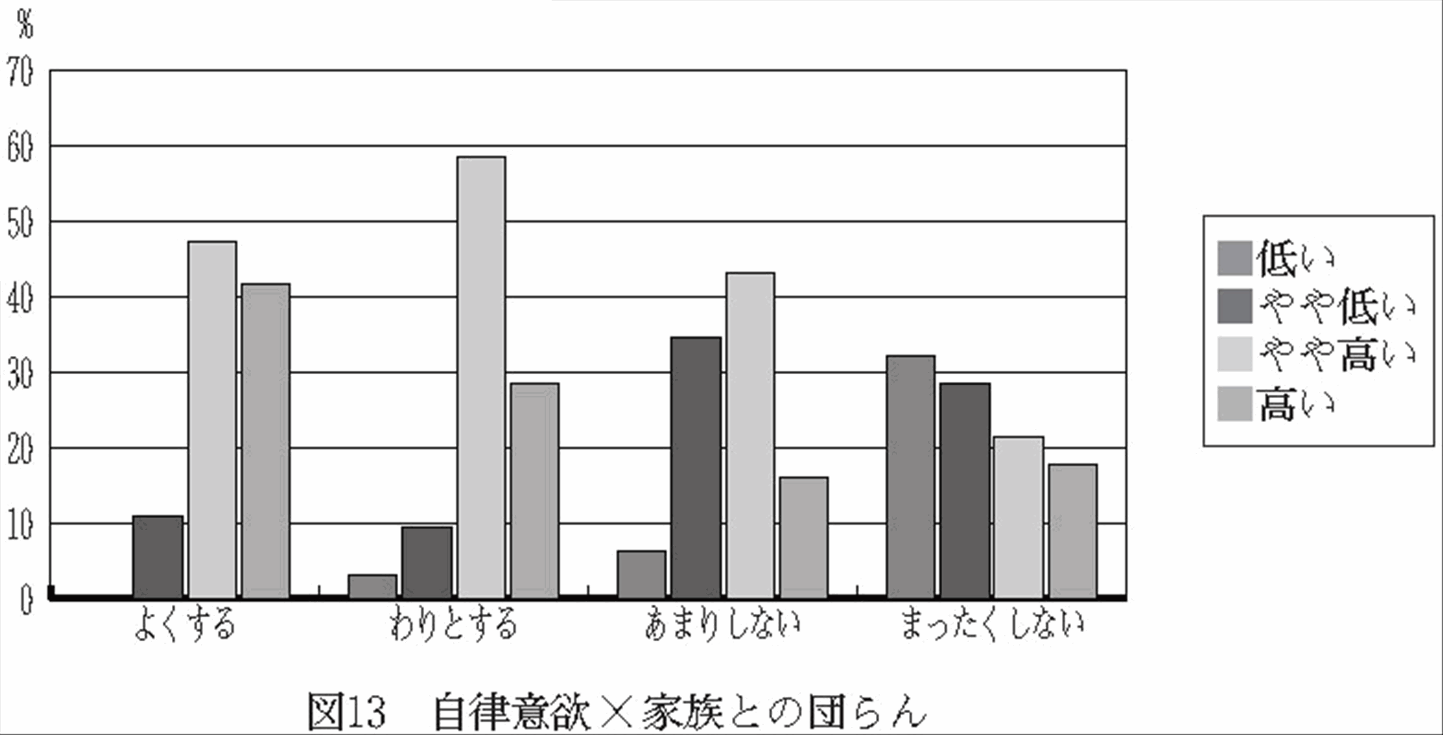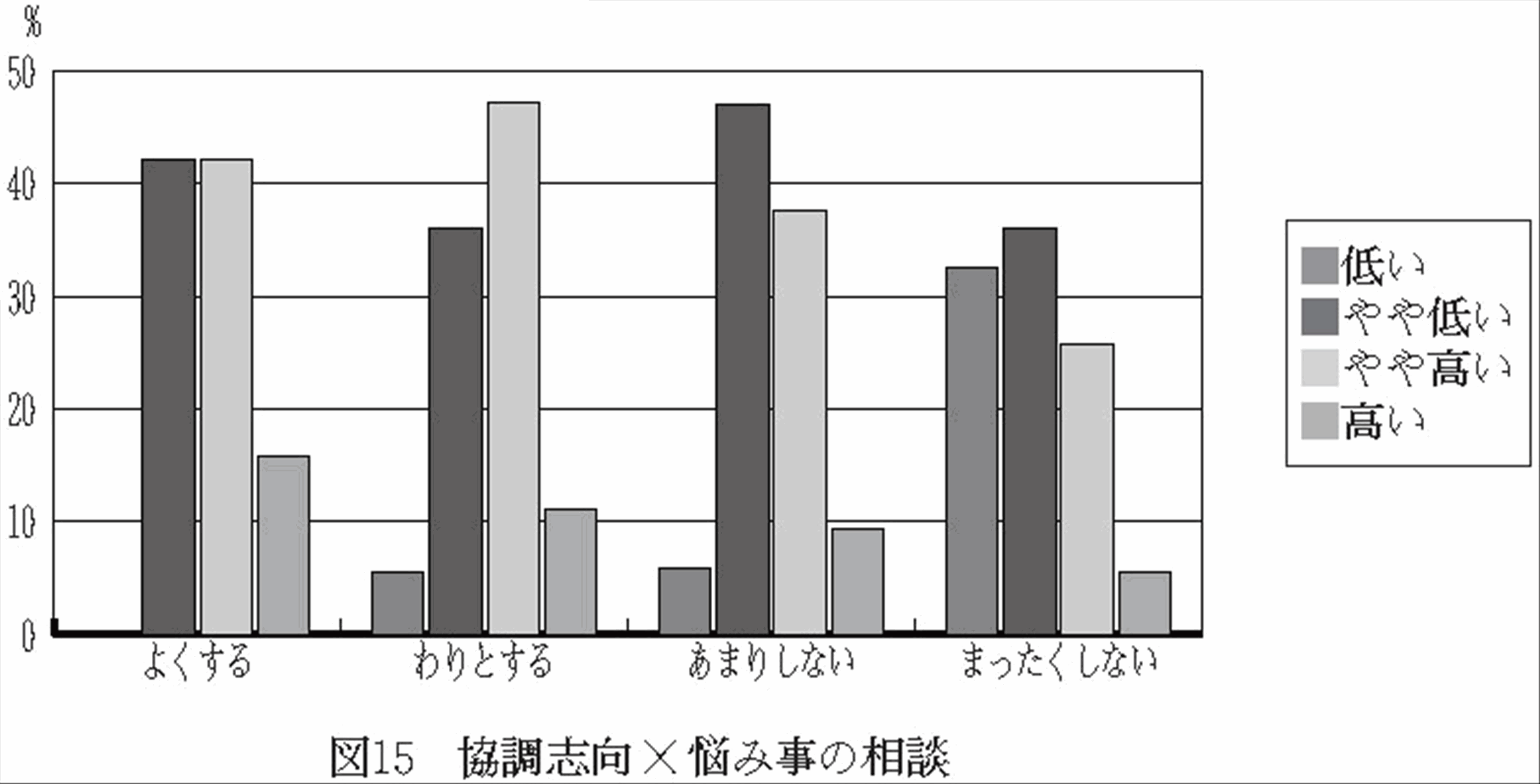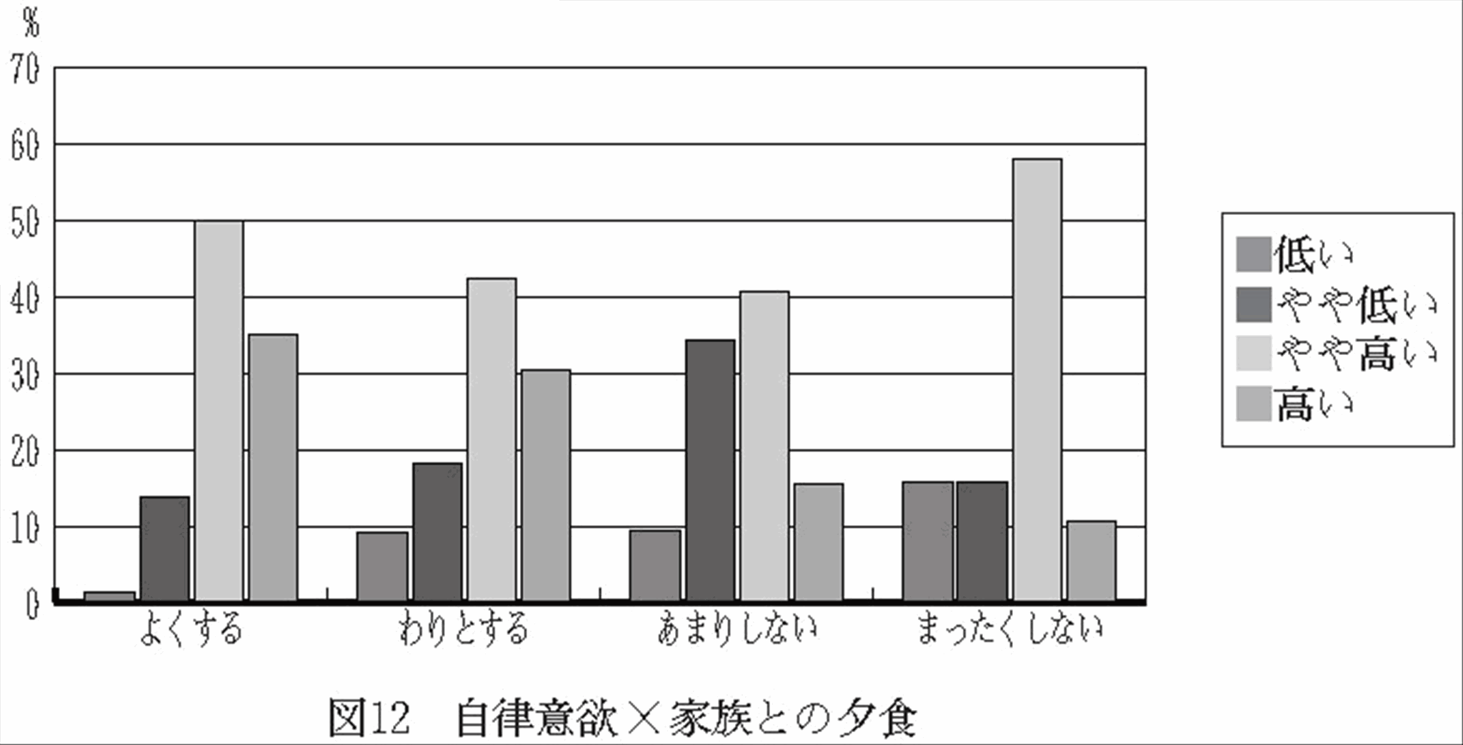 F3では、−6点から−4点までを「低い」、−3点から−1点までを「やや低い」、0点から3点までを「やや高い」、4点から6点までを「高い」として分類する。家庭での生活に関する質問は、以下の六つである。 1 家族に起こされる前に自分で起きる。 よくする わりとする あまりしない まったくしない 2 夕食を家族全員で食べる。(夕食) よくする わりとする あまりしない まったくしない 3 夕食の後、家族でおしゃべりをする。(家族団らん) よくする わりとする あまりしない まったくしない 4 家族そろって旅行をする。 よくする わりとする あまりしない まったくしない 5 あなたの友だちが家に泊まりにくる。 よくする わりとする あまりしない まったくしない 6 心配事や悩みを相談する。(悩み事の相談) よくする わりとする あまりしない まったくしない それぞれのクロス集計表からカイ二乗検定の結果、0.004以下のものを有意差ありとみなしてグラフ化したのが、図12〜16である(いずれも%表示)。 図12は、自律意欲の高低と、家族全員で夕食を食べる頻度の関係をグラフ化したものである。このグラフに見られるように、自律意欲の「高い」子どもに着目すると、家族全員での夕食は、「よくする」から、「まったくしない」までが、なだらかに少なくなってきている。 図13は、自律意欲の高低と家族団らんの頻度の関係をグラフ化したものである。自律意欲の「低い」子どもで、家族団らんをよくすると答えたものが全くいないことがまず注目されるが、自律意欲の高い子どもが家族団らんをよくすることがはっきりと示されている。 図14は協調志向と家族団らんの関係、図15は協調志向と悩み事の相談の関係をグラフ化したものである。どちらも、「やや低い」、「やや高い」の段階ではそれほどはっきりとした傾向は表れないが、「低い」、「高い」の両極で比較した場合には、協調指向の高い子どもは家族団らんに費やす時間が多く、悩み事の相談もよくするが、協調指向の低い子どもは家族団らんも少なく、悩み事の相談もあまりしないという関係が明白に表れている。 図16は他者志向と悩み事の相談の関係をグラフ化したものである。他者志向の「高い」および「やや高い」が、悩み事の相談を「よくする」、「わりとする」に集中し、「やや低い」が「あまりしない」、「まったくしない」に集中する傾向をみせている。それぞれの因子と、質問項目の夕食・団らん・悩み事の相談では有意差が表れたが、「家族に起こされる前に自分で起きる」、「家族そろって旅行をする」、「友だちが家に泊まりにくる」には顕著な有意差はみられなかった。したがって、自分で起きる前に家族から起こされたり、家族で旅行したり、友だちが家に泊まりにくるといったことは、抽出された因子とはあまり関係がないと考えられる。