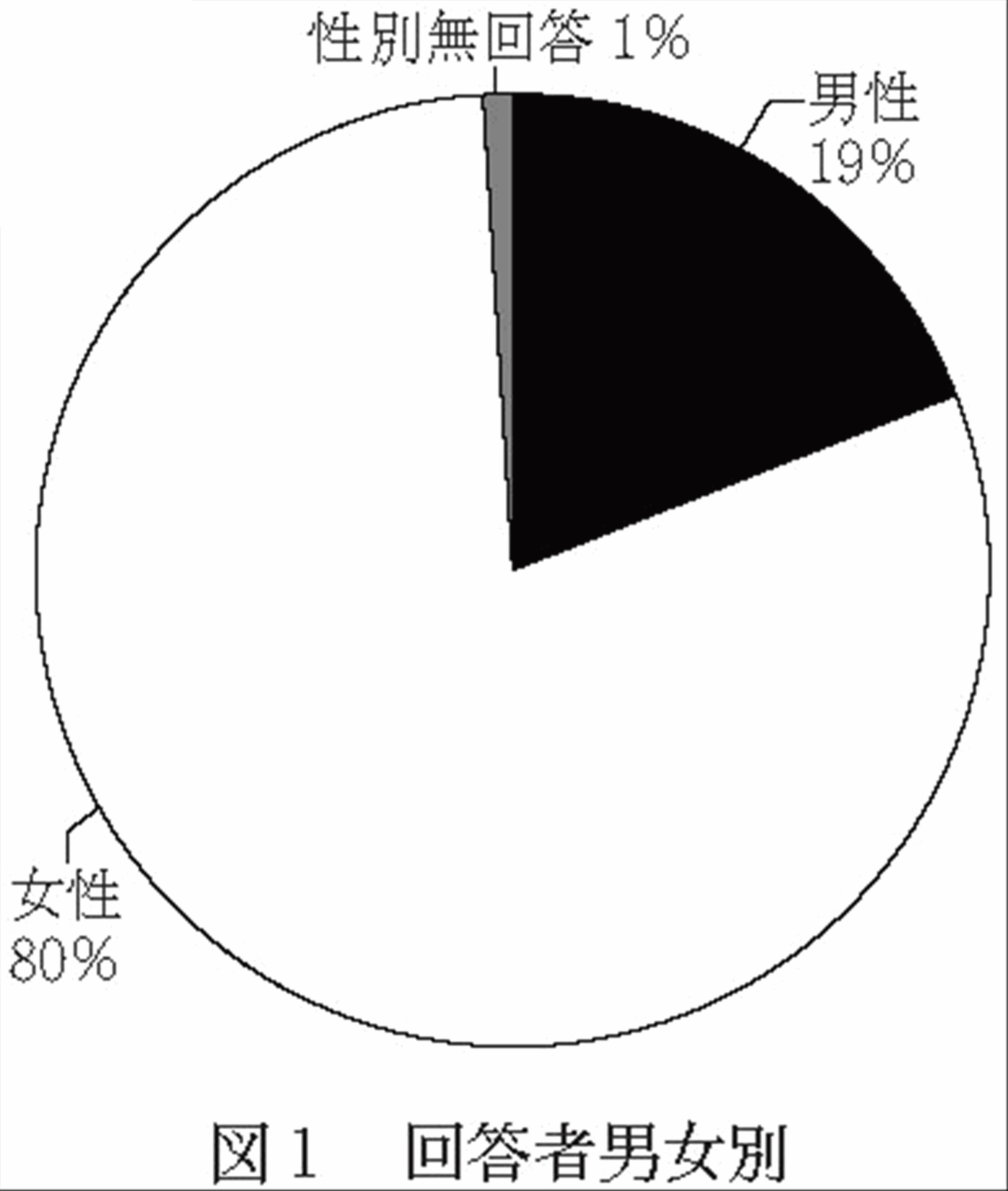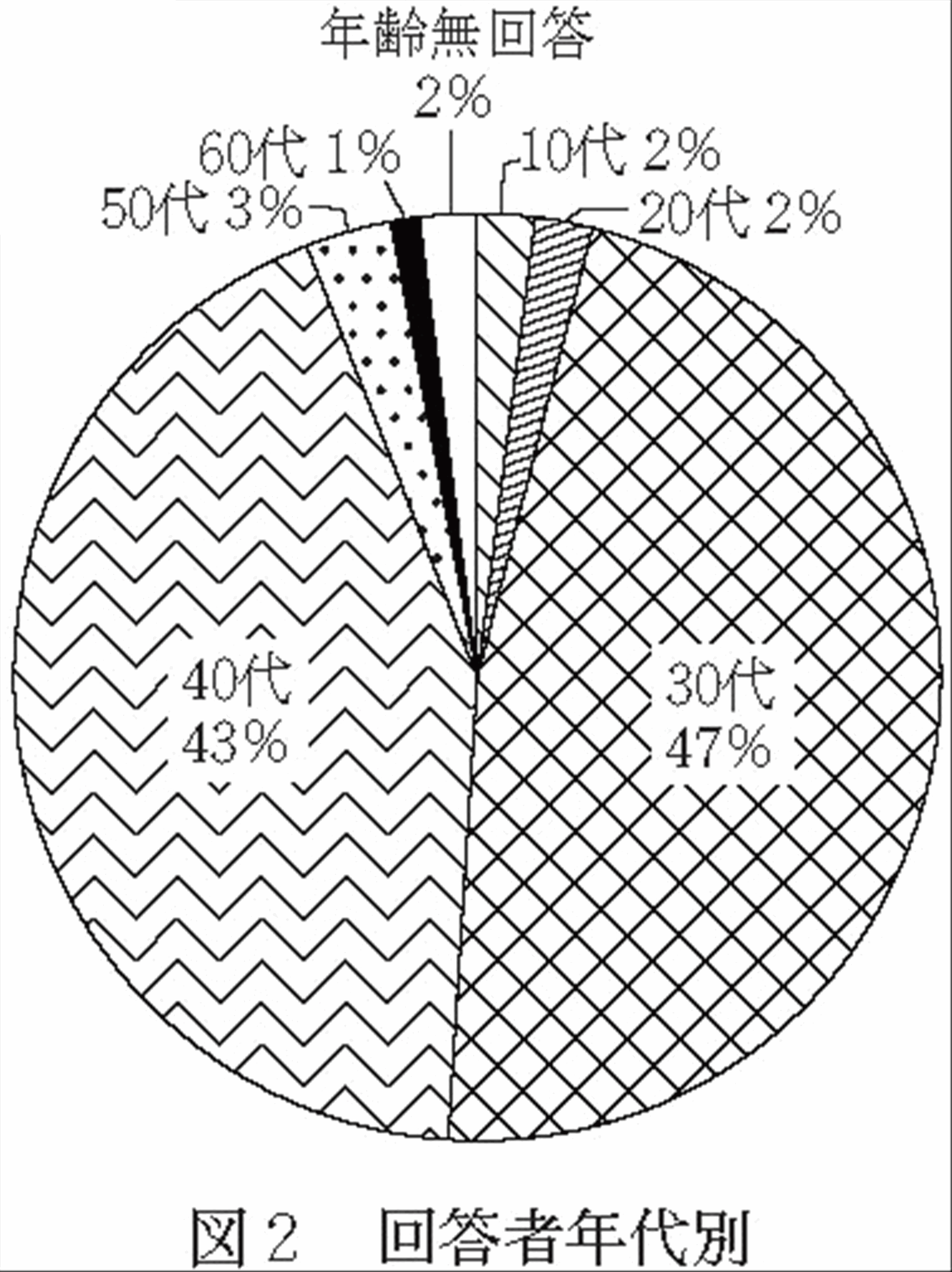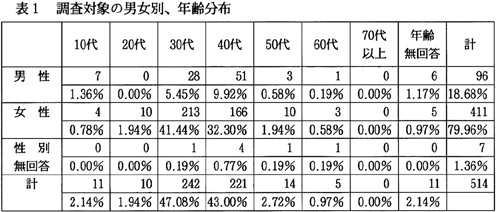 3.読書と図書館に関するアンケートの結果と分析 1)一般成人対象 このアンケートは、穴吹町内の五つの小学校と三つの中学校の協力のもとに、小・中学校生の保護者を対象に、514通の回答を得た。以下にその結果と分析を行う。 回答者の構成は、表1のとおりである。上段は回答数を、下段は全回答数に占める割合を表している。これらをグラフ化したものが図1、2である。年齢・性別に著しい偏りがあるが、これは小中学生の保護者を主たる対象としていることによる。