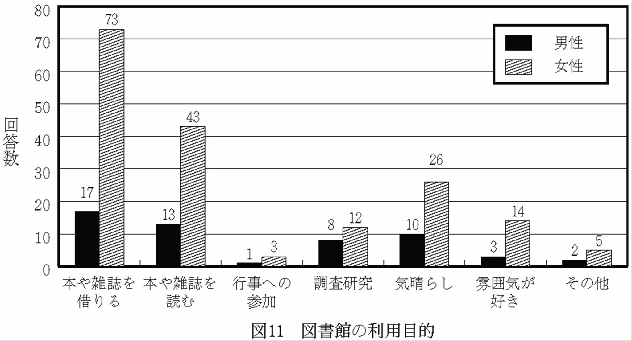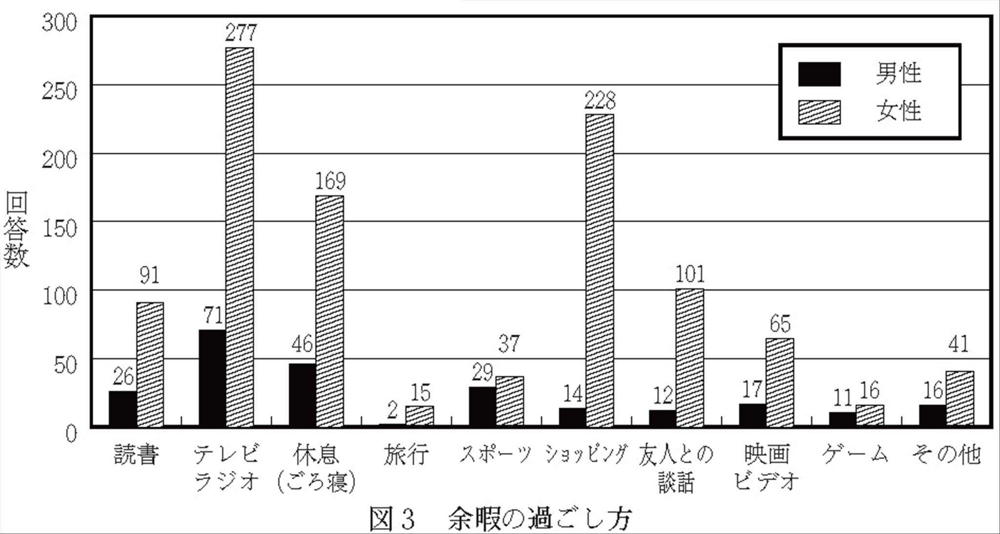 その他の回答:家事・雑用(7).ガーデニング・園芸(6).出かける(6).音楽鑑賞(5).インターネット・パソコン(3).畑仕事(3).釣り(2).洋裁(2).ボランティア.パチンコ.絵画.子どもと遊ぶ.写真.趣味.書道. 分析:男女ともに、テレビ・ラジオが多くを占めている(図3)。男性の場合はこれに次いで、休息、スポーツとなり、読書は第4位であった。女性は、ショッピング、休息、友人との談話と続き、読書は第5位であった。これは、本班が阿波学会総合学術調査で毎年継続して行っている調査と、ほぼ同様の結果である。